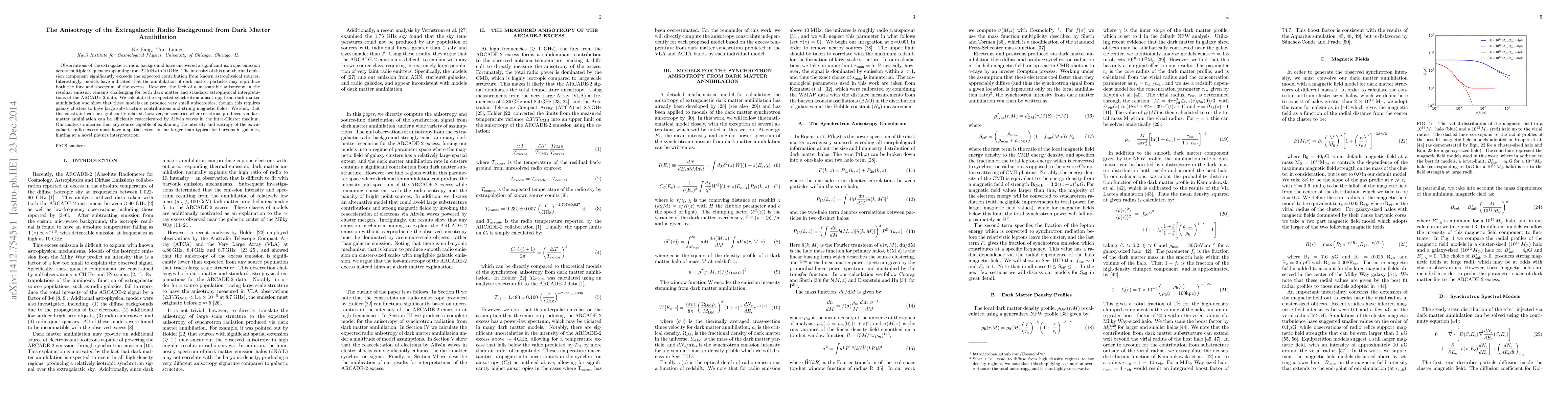 The research explores the extragalactic radio background excess, suggesting dark matter annihilation as a possible explanation due to matching flux and spectrum. However, the lack of measurable anisotropy poses a challenge. The study calculates anisotropy from dark matter models, finding small anisotropies possible with large substructures and strong magnetic fields, or via efficient electron reacceleration by Alfvén waves in the intra-cluster medium. The findings imply the source must have a vast spatial extension, hinting at new physics.