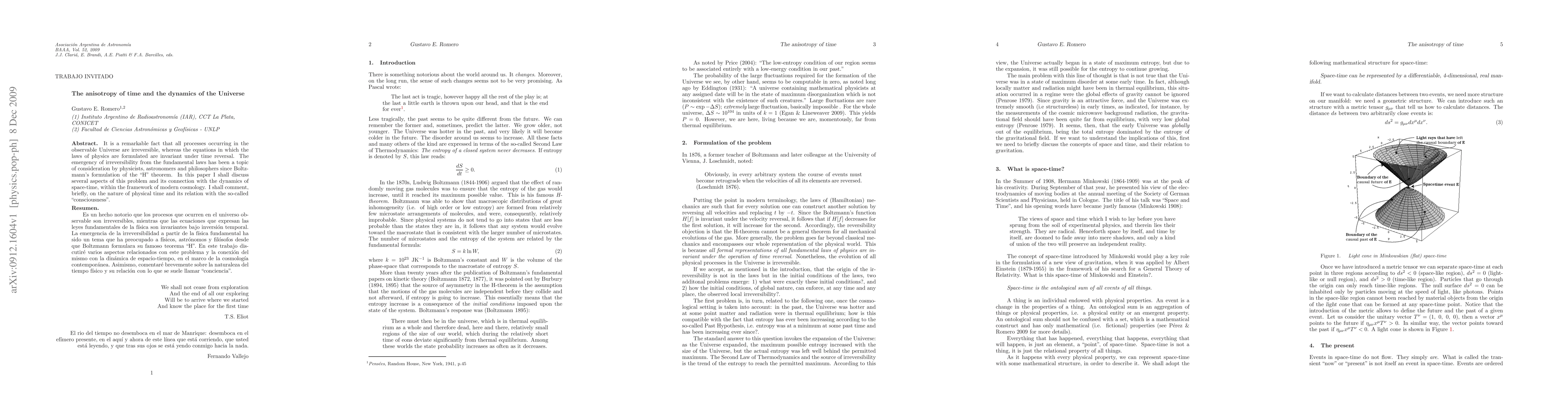 It is a remarkable fact that all processes occurring in the observable Universe are irreversible, whereas the equations in which the laws of physics are formulated are invariant under time reversal. The emergency of irreversibility from the fundamental laws has been a topic of consideration by physicists, astronomers and philosophers since Boltzmann's formulation of the "H" theorem. In this paper I shall discuss several aspects of this problem and its connection with the dynamics of space-time, within the framework of modern cosmology. I shall comment, briefly, on the nature of physical time and its relation with the so-called "consciousness".