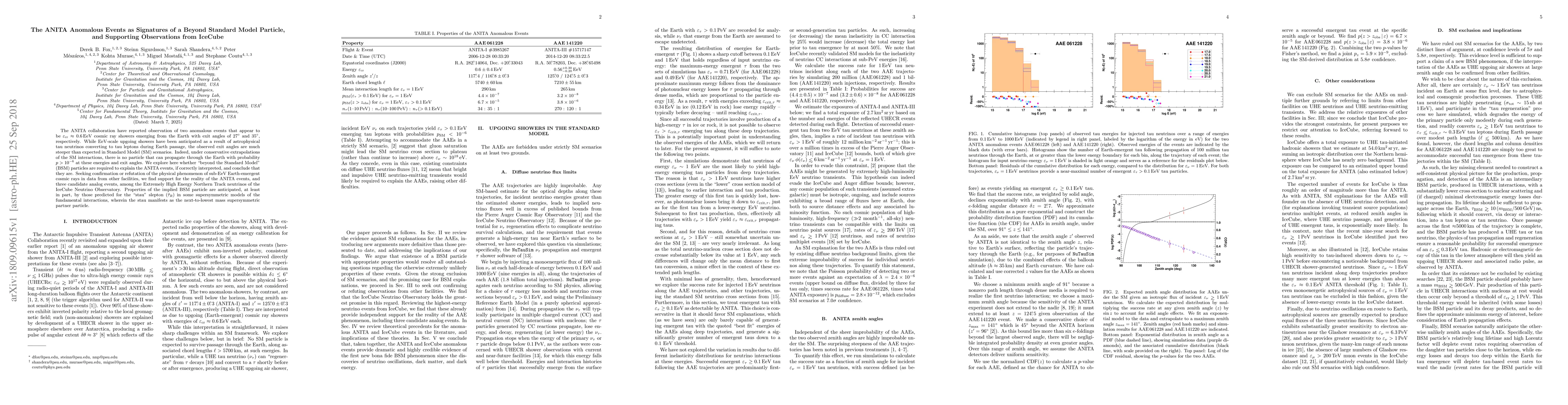 The ANITA collaboration have reported observation of two anomalous events that appear to be $\varepsilon_{\rm cr} \approx 0.6$ EeV cosmic ray showers emerging from the Earth with exit angles of $27^\circ$ and $35^\circ$, respectively. While EeV-scale upgoing showers have been anticipated as a result of astrophysical tau neutrinos converting to tau leptons during Earth passage, the observed exit angles are much steeper than expected in Standard Model (SM) scenarios. Indeed, under conservative extrapolations of the SM interactions, there is no particle that can propagate through the Earth with probability $p > 10^{-6}$ at these energies and exit angles. We explore here whether "beyond the Standard Model" (BSM) particles are required to explain the ANITA events, if correctly interpreted, and conclude that they are. Seeking confirmation or refutation of the physical phenomenon of sub-EeV Earth-emergent cosmic rays in data from other facilities, we find support for the reality of the ANITA events, and three candidate analog events, among the Extremely High Energy Northern Track neutrinos of the IceCube Neutrino Observatory. Properties of the implied BSM particle are anticipated, at least in part, by those predicted for the "stau" slepton ($\tilde{\tau}_R$) in some supersymmetric models of the fundamental interactions, wherein the stau manifests as the next-to-lowest mass supersymmetric partner particle.