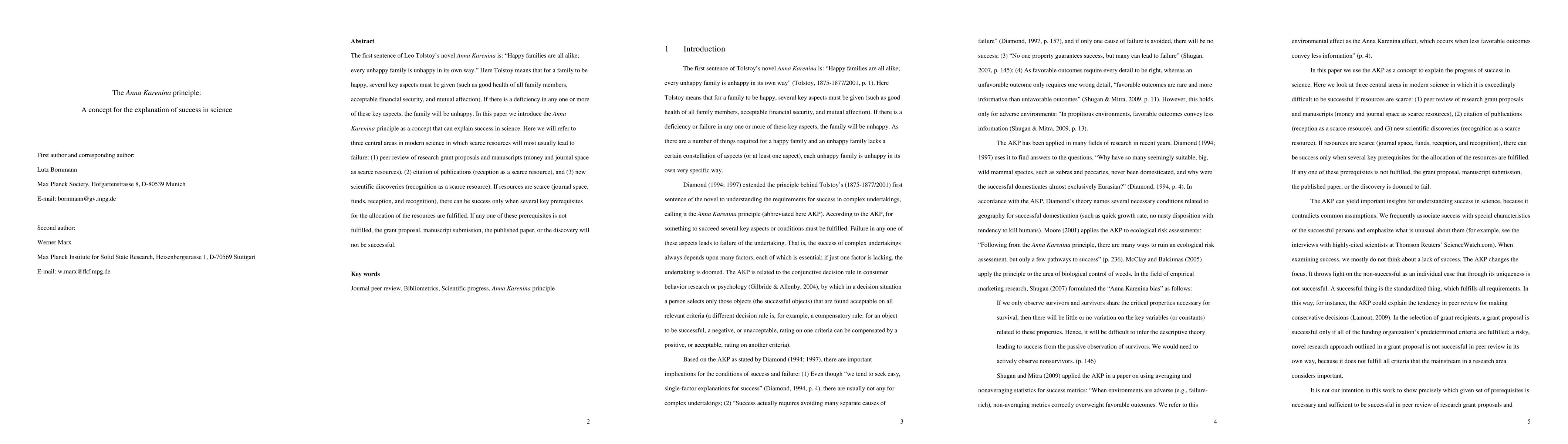 The first sentence of Leo Tolstoy's novel Anna Karenina is: "Happy families are all alike; every unhappy family is unhappy in its own way." Here Tolstoy means that for a family to be happy, several key aspects must be given (such as good health of all family members, acceptable financial security, and mutual affection). If there is a deficiency in any one or more of these key aspects, the family will be unhappy. In this paper we introduce the Anna Karenina principle as a concept that can explain success in science. Here we will refer to three central areas in modern science in which scarce resources will most usually lead to failure: (1) peer review of research grant proposals and manuscripts (money and journal space as scarce resources), (2) citation of publications (reception as a scarce resource), and (3) new scientific discoveries (recognition as a scarce resource). If resources are scarce (journal space, funds, reception, and recognition), there can be success only when several key prerequisites for the allocation of the resources are fulfilled. If any one of these prerequisites is not fulfilled, the grant proposal, manuscript submission, the published paper, or the discovery will not be successful.