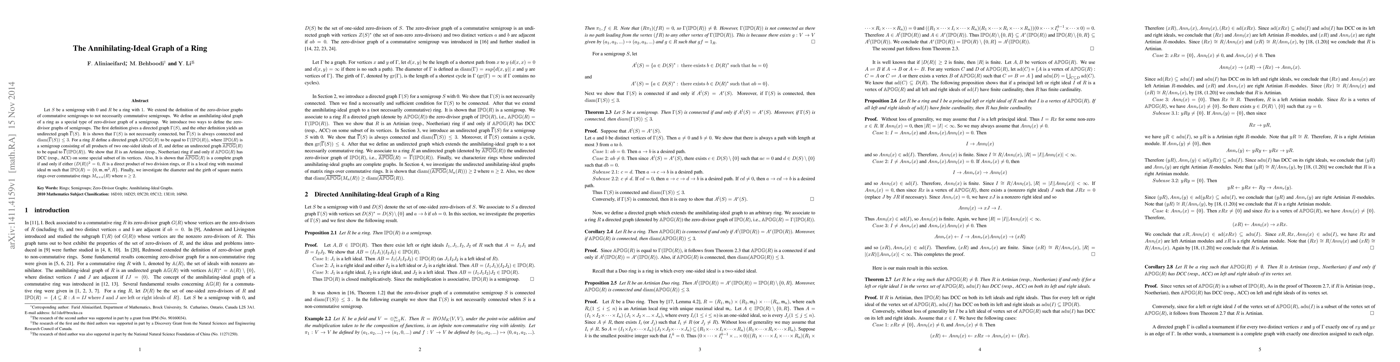 This paper defines an annihilating-ideal graph of a ring as a type of zero-divisor graph for semigroups, showing that the undirected version is always connected with a diameter of at most 3. It also explores connections between the graph properties and the ring's structure, including conditions for the graph to be complete and investigations into the diameter and girth of matrix rings over commutative rings.