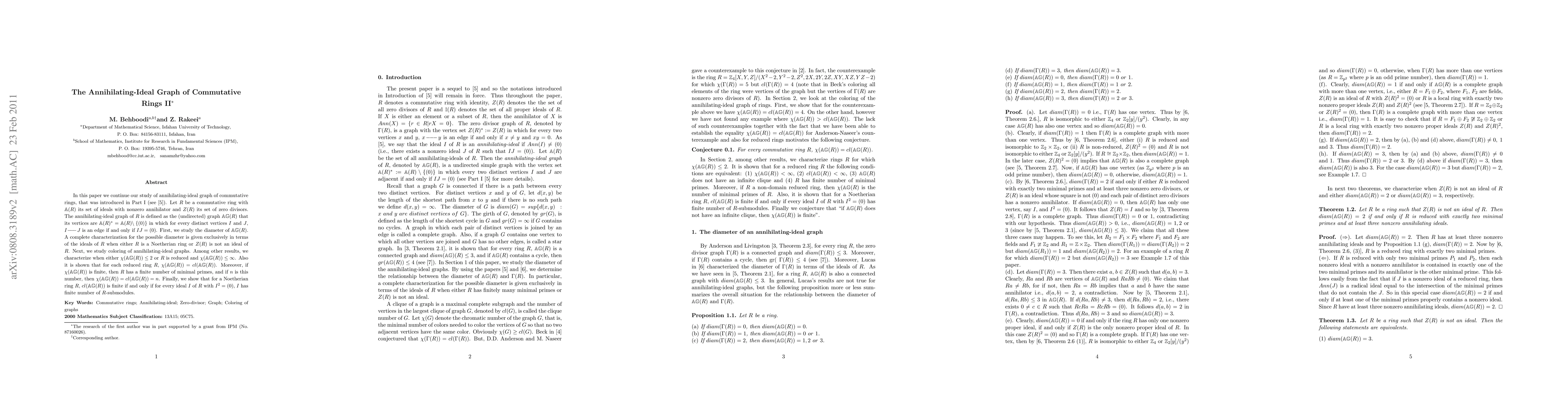 This paper continues the study of the annihilating-ideal graph of commutative rings, focusing on the graph's diameter and coloring properties. It provides a complete characterization of the diameter in specific ring conditions and explores conditions under which the chromatic number is finite or infinite.