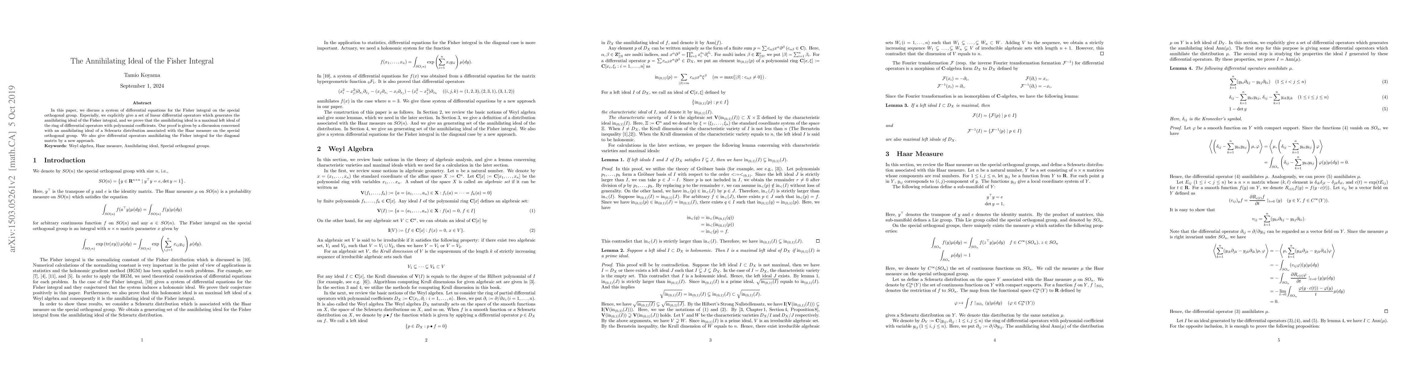 This paper identifies a set of linear differential operators that generate the annihilating ideal of the Fisher integral on the special orthogonal group, proving it to be a maximal left ideal of the ring of differential operators with polynomial coefficients. The proof leverages the annihilating ideal of a Schwartz distribution linked to the Haar measure on the special orthogonal group.