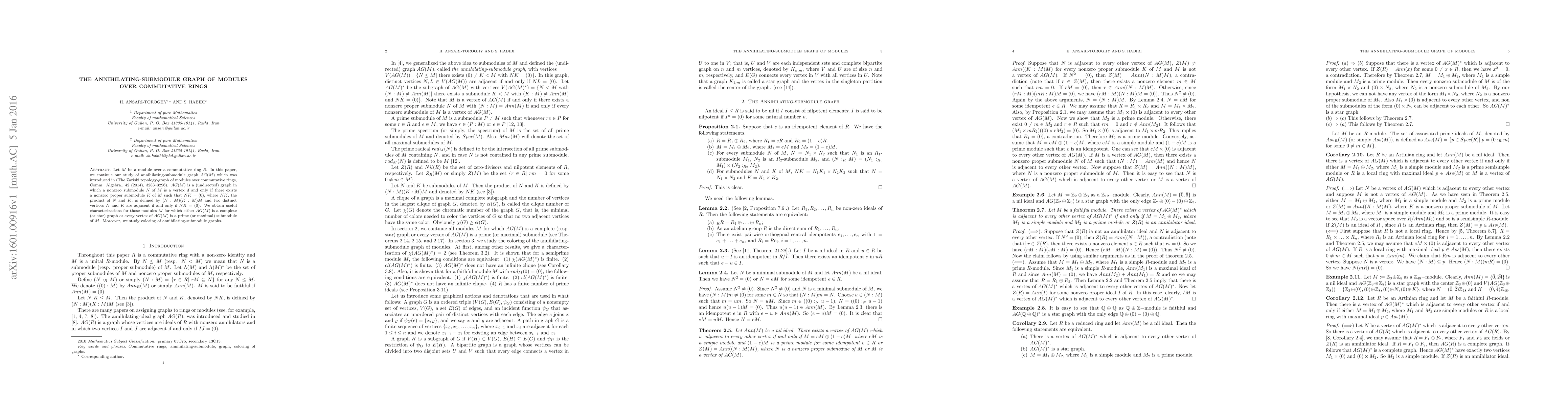 This paper explores the annihilating-submodule graph AG(M) of modules over commutative rings, characterizing modules where AG(M) is complete or star, and investigates the prime or maximal submodule properties of its vertices, along with the graph's coloring.