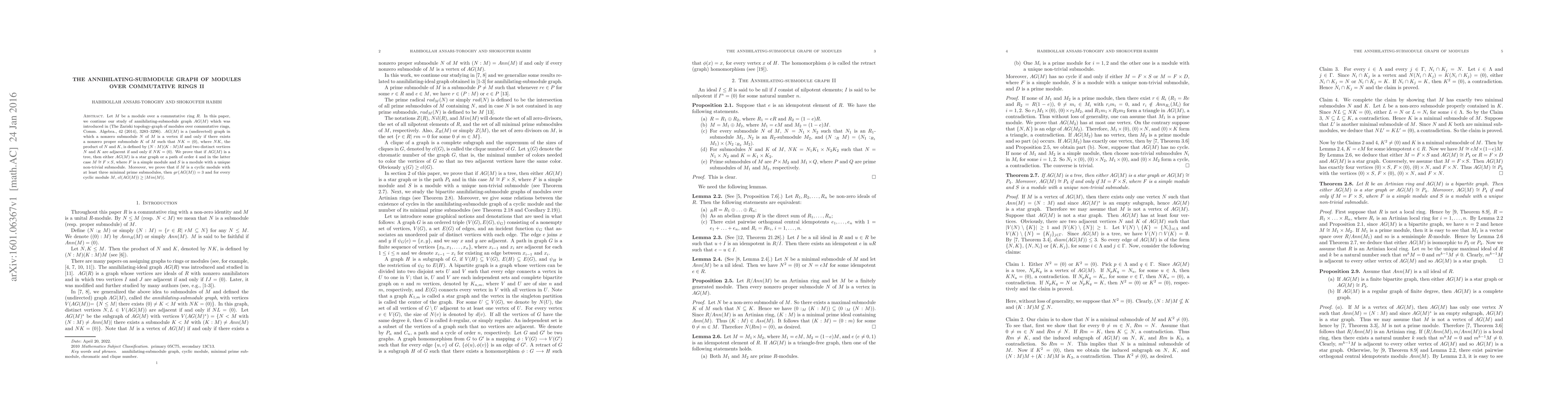 Let M be a module over a commutative ring R. In this paper, we continue our study of annihilating-submodule graph AG(M) which was introduced in (The Zariski topology-graph of modules over commutative rings, Comm. Algebra., 42 (2014), 3283{3296). AG(M) is a (undirected) graph in which a nonzero submodule N of M is a vertex if and only if there exists a nonzero proper submodule K of M such that NK = (0), where NK, the product of N and K, is defined by (N : M)(K : M)M and two distinct vertices N and K are adjacent if and only if NK = (0). We prove that if AG(M) is a tree, then either AG(M) is a star graph or a path of order 4 and in the latter case M\cong F\times ?S, where F is a simple module and S is a module with a unique non-trivial submodule. Moreover, we prove that if M is a cyclic module with at least three minimal prime submodules, then gr(AG(M)) = 3 and for every cyclic module M, cl(AG(M))\geq |Min(M)|.