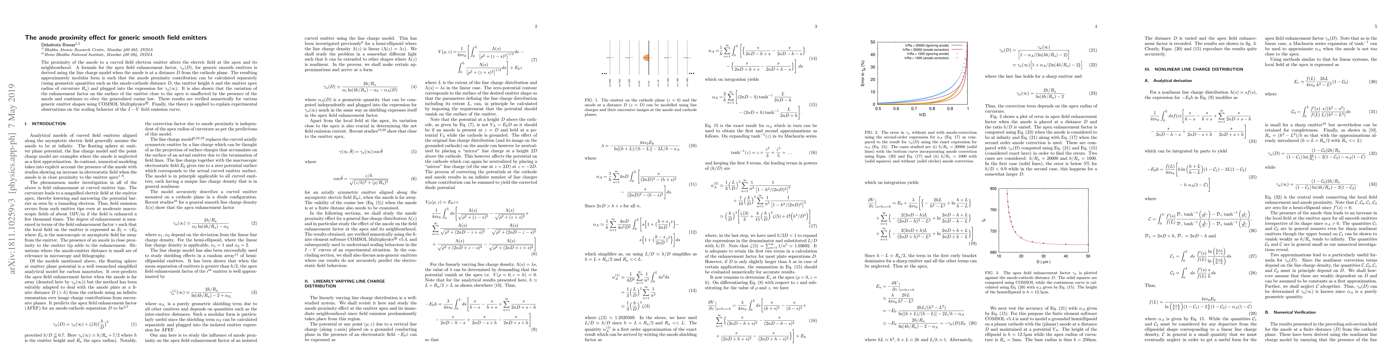 The proximity of the anode to a curved field electron emitter alters the electric field at the apex and its neighbourhood. A formula for the apex field enhancement factor, $\gamma_a(D)$, for generic smooth emitters is derived using the line charge model when the anode is at a distance $D$ from the cathode plane. The resulting approximately modular form is such that the anode proximity contribution can be calculated separately (using geometric quantities such as the anode-cathode distance $D$, the emitter height $h$ and the emitter apex radius of curvature $R_a$) and plugged into the expression for $\gamma_a(\infty)$. It is also shown that the variation of the enhancement factor on the surface of the emitter close to the apex is unaffected by the presence of the anode and continues to obey the generalized cosine law. These results are verified numerically for various generic emitter shapes using COMSOL Multiphysics. Finally, the theory is applied to explain experimental observations on the scaling behavior of the $I-V$ field emission curve.