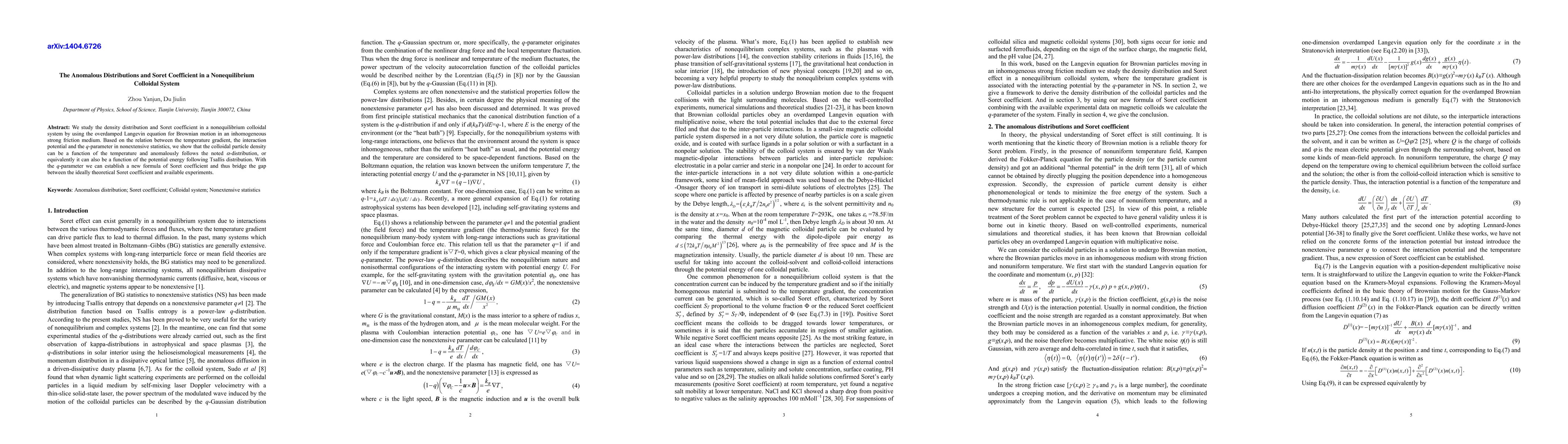 The density distributions and Soret coefficient in a nonequilibrium colloidal system with nonuniform temperature are studied by the overdamped Langevin equation for Brownian motion in an inhomogeneous strong friction medium. Based on the relation between the temperature gradient, the interaction potential and the q-parameter in nonextensive statistics, We show that the colloidal particle density can be a function of the temperature and anomalously follows the noted alpha-distribution, or equivalently it can also be a function of the potential energy and follows Tsallis distribution. With the q-parameter we can establish a new formula of the Soret coefficient and thus, bridge the gap between the ideally theoretical Soret coefficient and available experiments.