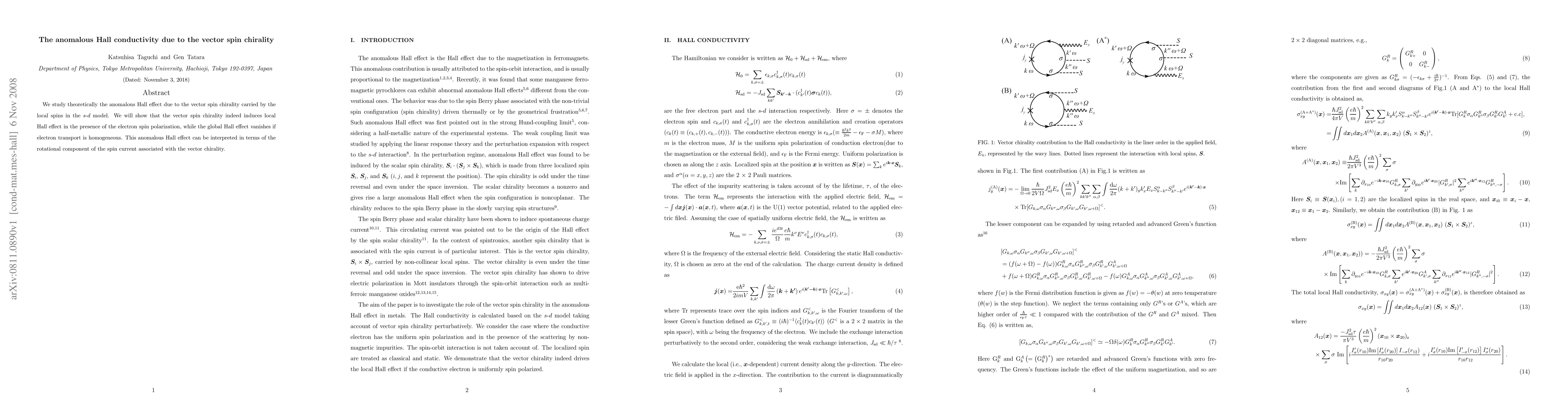 This paper theoretically explores the anomalous Hall effect induced by vector spin chirality in an $s$-$d$ model, demonstrating that local Hall effect occurs with electron spin polarization, while global Hall effect disappears under homogeneous electron transport. The effect is linked to the rotational component of spin current.