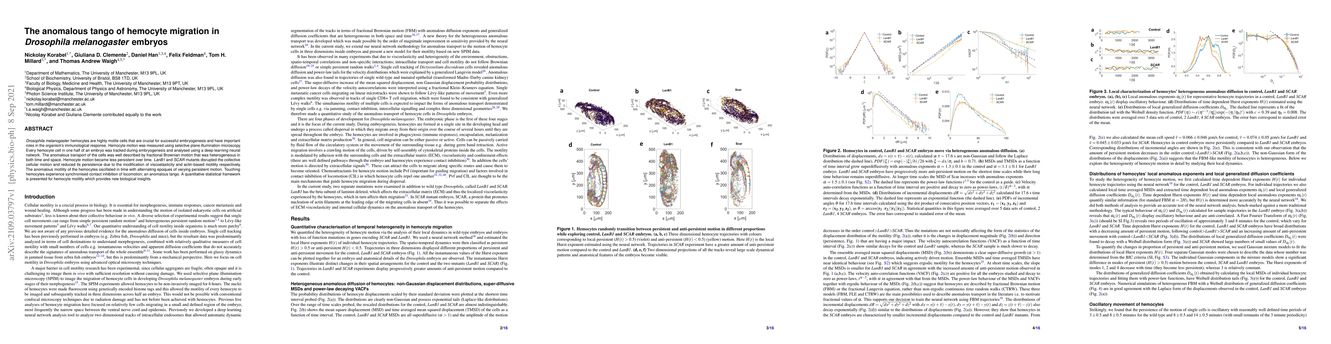 Drosophila melanogaster hemocytes are highly motile cells that are crucial for successful embryogenesis and have important roles in the organism's immunological response. Hemocyte motion was measured using selective plane illumination microscopy. Every hemocyte cell in one half of an embryo was tracked during embryogenesis and analysed using a deep learning neural network. The anomalous transport of the cells was well described by fractional Brownian motion that was heterogeneous in both time and space. Hemocyte motion became less persistent over time. LanB1 and SCAR mutants disrupted the collective cellular motion and reduced its persistence due to the modification of viscoelasticity and actin-based motility respectively. The anomalous motility of the hemocytes oscillated in time with alternating epoques of varying persistent motion. Touching hemocytes experience synchronised contact inhibition of locomotion; an anomalous tango. A quantitative statistical framework is presented for hemocyte motility which provides new biological insights.