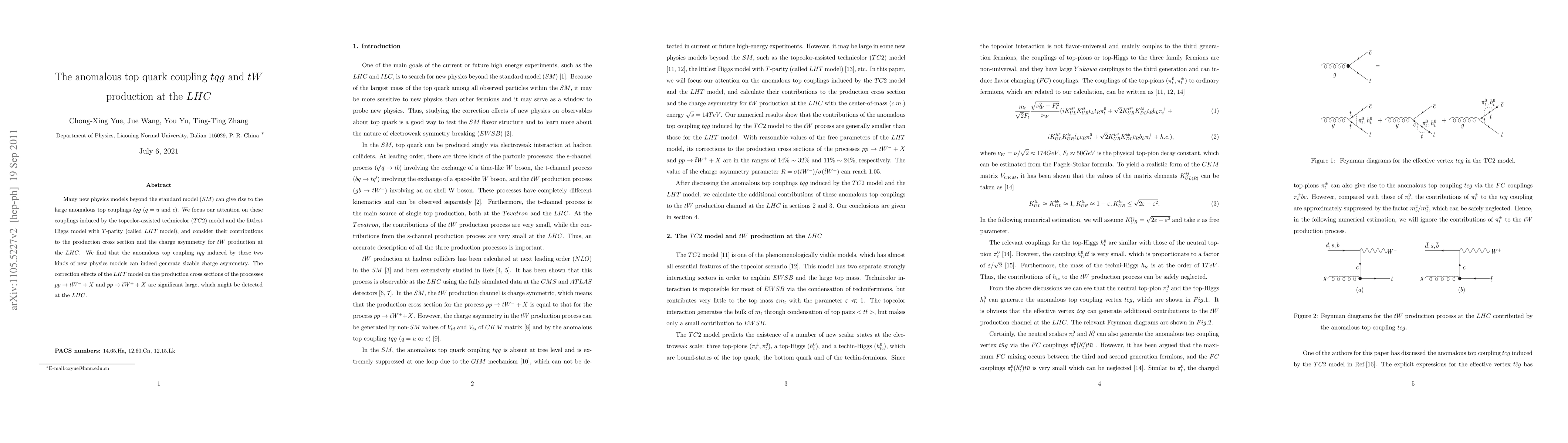 This paper investigates the impact of anomalous top quark couplings $tqg$ from the topcolor-assisted technicolor and littlest Higgs models on $tW$ production at the LHC, finding significant charge asymmetry and large correction effects that could be detectable.