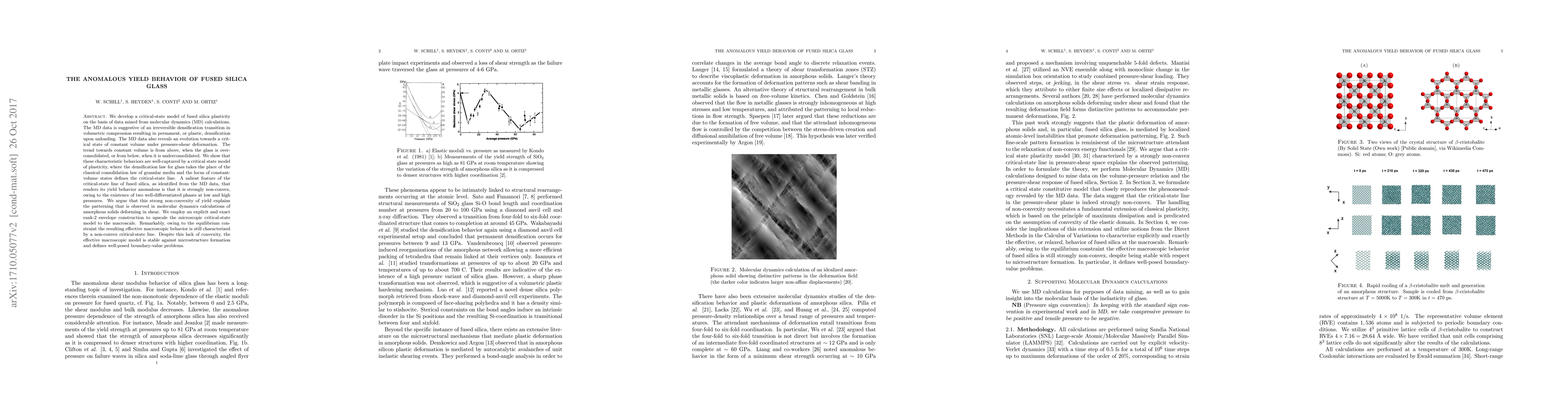 We develop a critical-state model of fused silica plasticity on the basis of data mined from molecular dynamics (MD) calculations. The MD data is suggestive of an irreversible densification transition in volumetric compression resulting in permanent, or plastic, densification upon unloading. The MD data also reveals an evolution towards a critical state of constant volume under pressure-shear deformation. The trend towards constant volume is from above, when the glass is overconsolidated, or from below, when it is underconsolidated. We show that these characteristic behaviors are well-captured by a critical state model of plasticity, where the densification law for glass takes the place of the classical consolidation law of granular media and the locus of constant volume states denotes the critical-state line. A salient feature of the critical-state line of fused silica, as identified from the MD data, that renders its yield behavior anomalous is that it is strongly non-convex, owing to the existence of two well-differentiated phases at low and high pressures. We argue that this strong non-convexity of yield explains the patterning that is observed in molecular dynamics calculations of amorphous solids deforming in shear. We employ an explicit and exact rank-2 envelope construction to upscale the microscopic critical-state model to the macroscale. Remarkably, owing to the equilibrium constraint the resulting effective macroscopic behavior is still characterized by a non-convex critical-state line. Despite this lack of convexity, the effective macroscopic model is stable against microstructure formation and defines well-posed boundary-value problems.