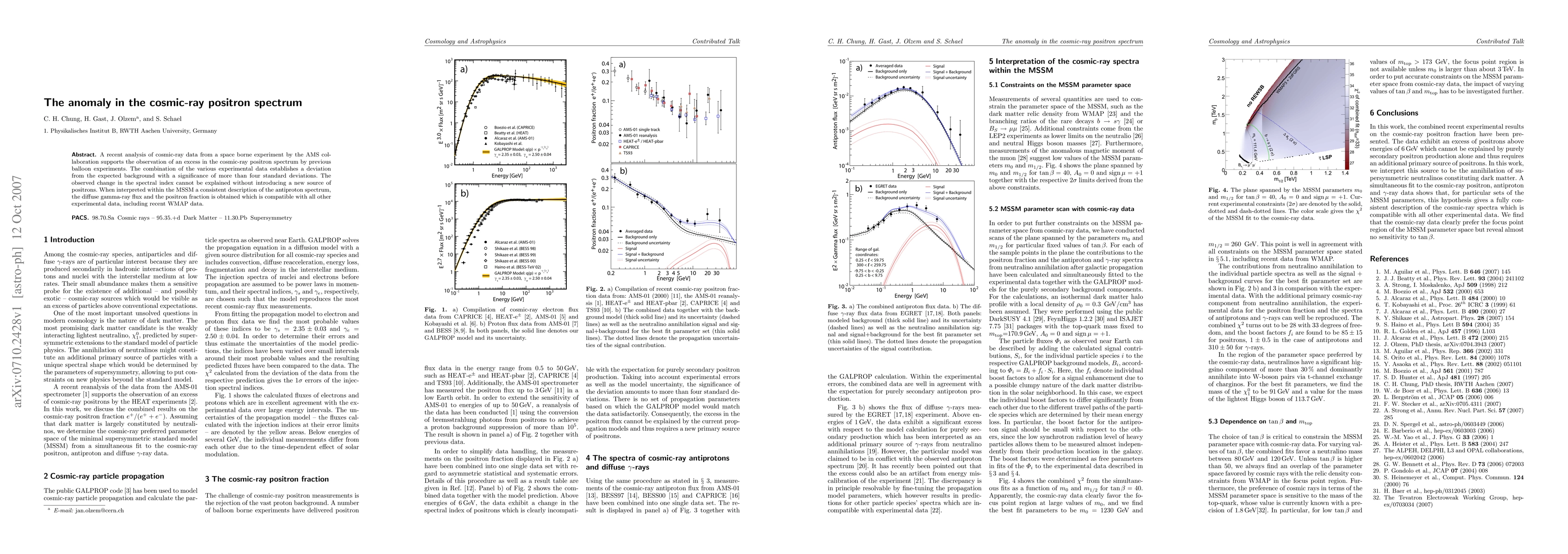 The AMS collaboration's analysis of cosmic-ray data reveals a significant excess in the positron spectrum, deviating from expected background by over four standard deviations. This anomaly suggests a new source of positrons, potentially explained by the Minimal Supersymmetric Standard Model (MSSM).