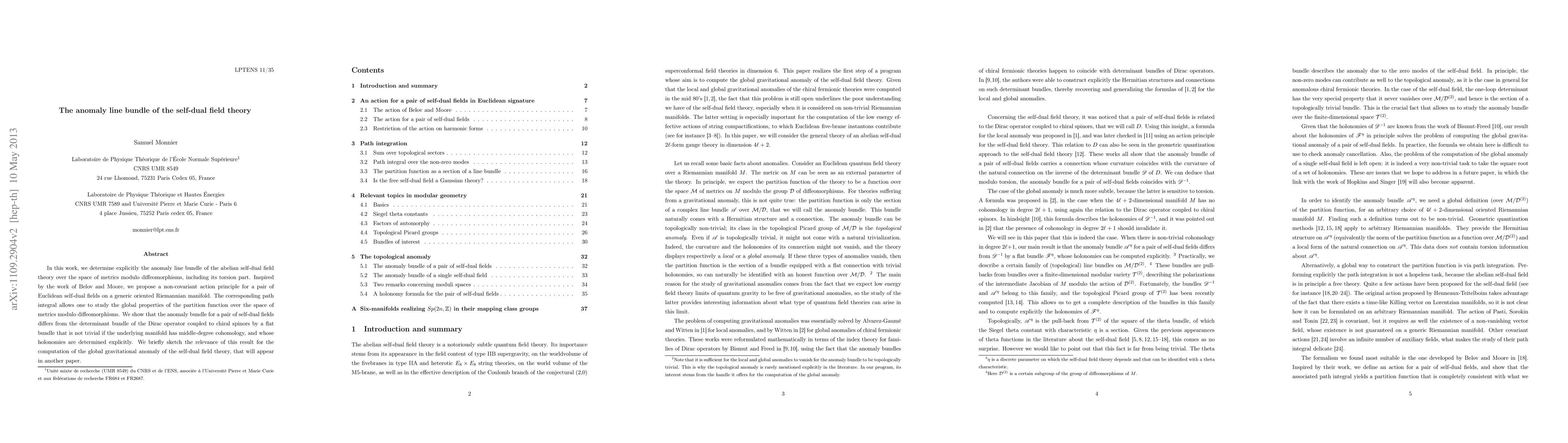 In this work, we determine explicitly the anomaly line bundle of the abelian self-dual field theory over the space of metrics modulo diffeomorphisms, including its torsion part. Inspired by the work of Belov and Moore, we propose a non-covariant action principle for a pair of Euclidean self-dual fields on a generic oriented Riemannian manifold. The corresponding path integral allows to study the global properties of the partition function over the space of metrics modulo diffeomorphisms. We show that the anomaly bundle for a pair of self-dual fields differs from the determinant bundle of the Dirac operator coupled to chiral spinors by a flat bundle that is not trivial if the underlying manifold has middle-degree cohomology, and whose holonomies are determined explicitly. We briefly sketch the relevance of this result for the computation of the global gravitational anomaly of the self-dual field theory, that will appear in another paper.