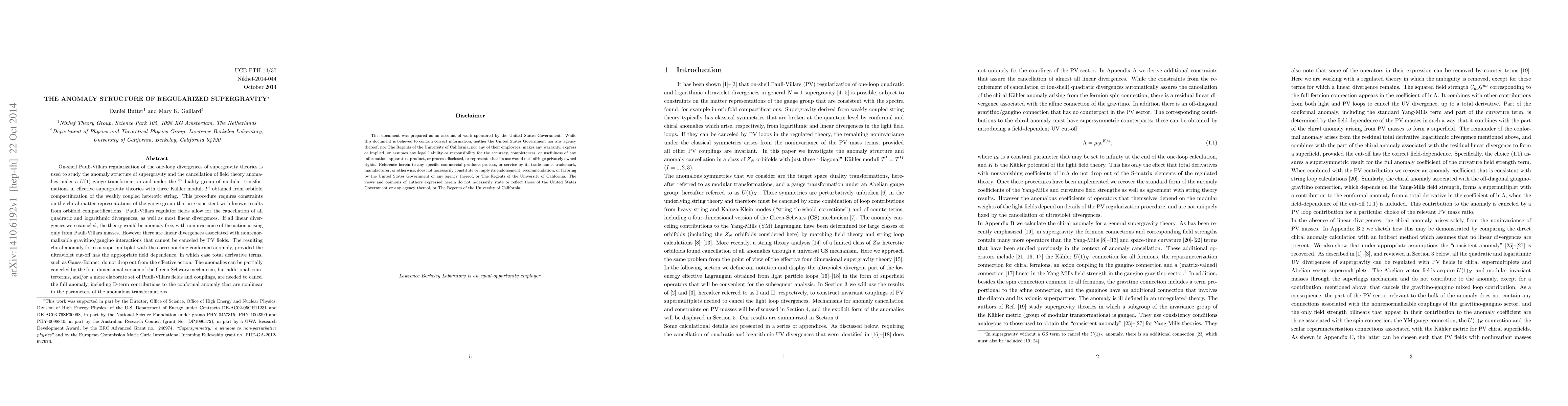 This paper investigates the anomaly structure in regularized supergravity using Pauli-Villars regularization to cancel loop divergences. It finds that while most divergences can be canceled, residual chiral anomalies remain due to nonrenormalizable interactions, requiring further mechanisms or regulator fields for complete anomaly cancellation.