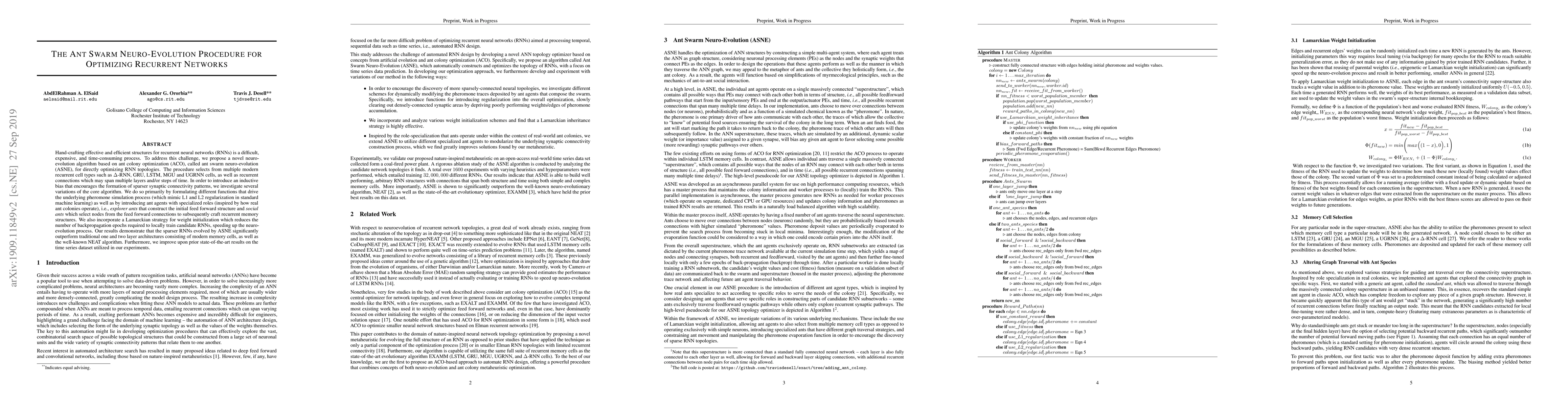This paper proposes an ant swarm neuro-evolution (ASNE) algorithm based on ant colony optimization to optimize recurrent neural network (RNN) topologies, outperforming traditional architectures and the NEAT algorithm. ASNE incorporates specialized ant roles, L1/L2 regularization functions, and a Lamarckian strategy to speed up the evolution process and produce sparser, more efficient RNNs.