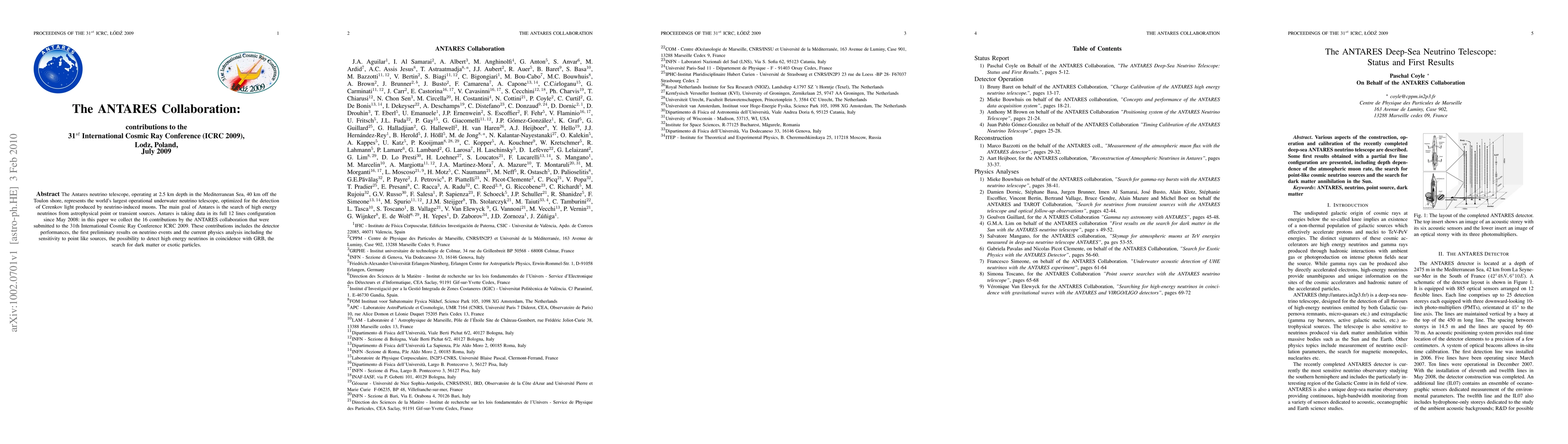 The Antares neutrino telescope, operating at 2.5 km depth in the Mediterranean Sea, 40 km off the Toulon shore, represents the world's largest operational underwater neutrino telescope, optimized for the detection of Cerenkov light produced by neutrino-induced muons. The main goal of Antares is the search of high energy neutrinos from astrophysical point or transient sources. Antares is taking data in its full 12 lines configuration since May 2008: in this paper we collect the 16 contributions by the ANTARES collaboration that were submitted to the 31th International Cosmic Ray Conference ICRC 2009. These contributions includes the detector performances, the first preliminary results on neutrino events and the current physics analysis including the sensitivity to point like sources, the possibility to detect high energy neutrinos in coincidence with GRB, the search for dark matter or exotic particles.