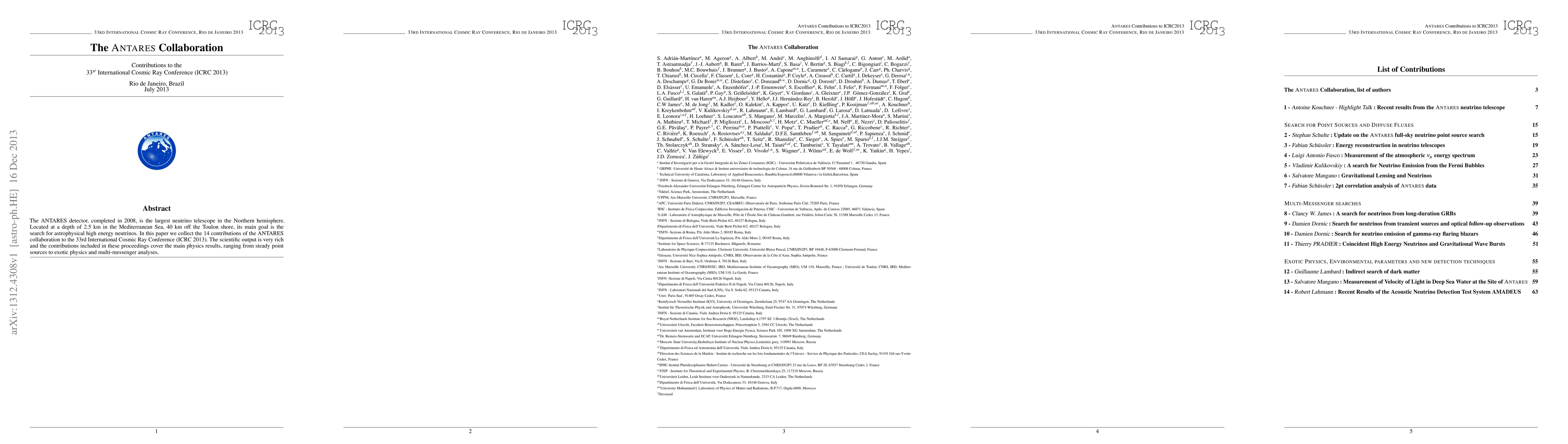 The ANTARES detector, completed in 2008, is the largest neutrino telescope in the Northern hemisphere. Located at a depth of 2.5 km in the Mediterranean Sea, 40 km off the Toulon shore, its main goal is the search for astrophysical high energy neutrinos. In this paper we collect the 14 contributions of the ANTARES collaboration to the 33rd International Cosmic Ray Conference (ICRC 2013). The scientific output is very rich and the contributions included in these proceedings cover the main physics results, ranging from steady point sources to exotic physics and multi-messenger analyses.