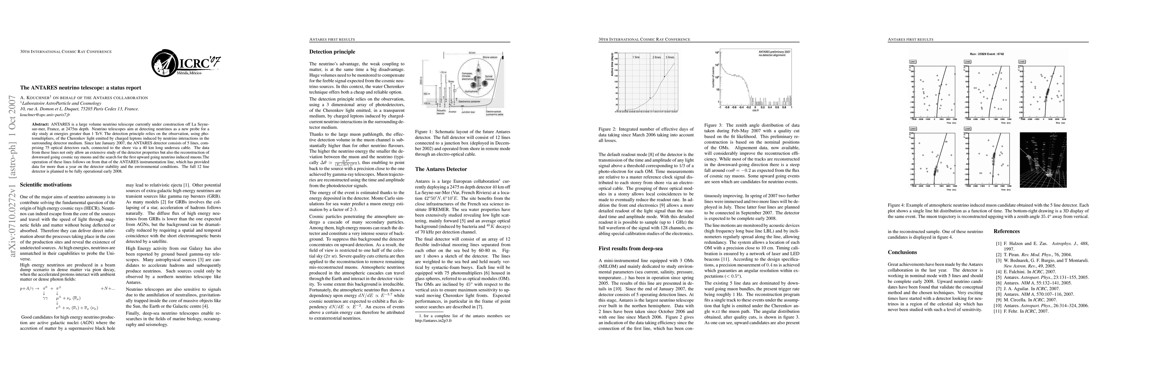 The ANTARES detector represents a significant technical achievement in deep-sea neutrino telescopes, utilizing a large volume of transparent medium (Mediterranean Sea) and advanced photomultiplier technology for Cherenkov light detection.