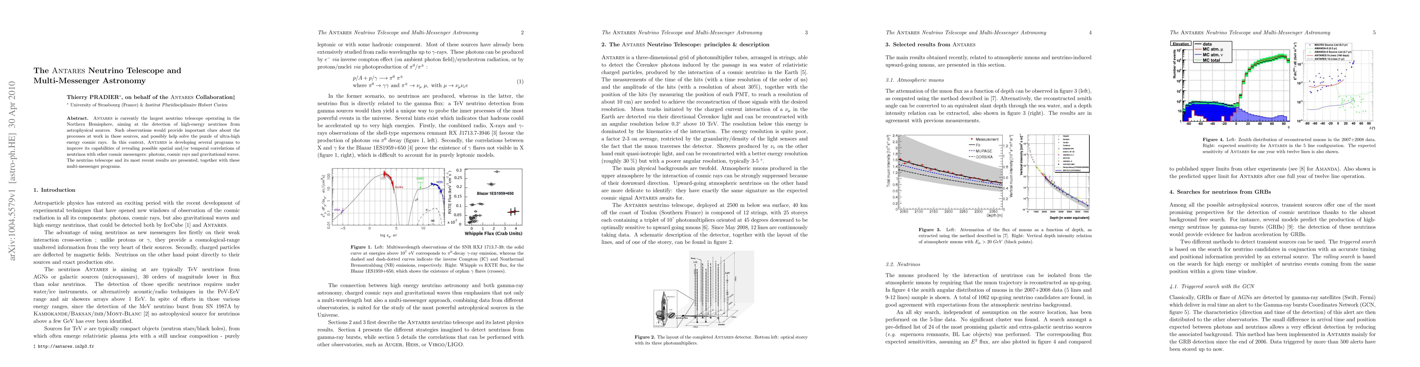 The Antares Neutrino Telescope, the largest in the Northern Hemisphere, detects high-energy astrophysical neutrinos to uncover cosmic ray origins. It also explores multi-messenger astronomy to correlate neutrinos with photons, cosmic rays, and gravitational waves for deeper insights.