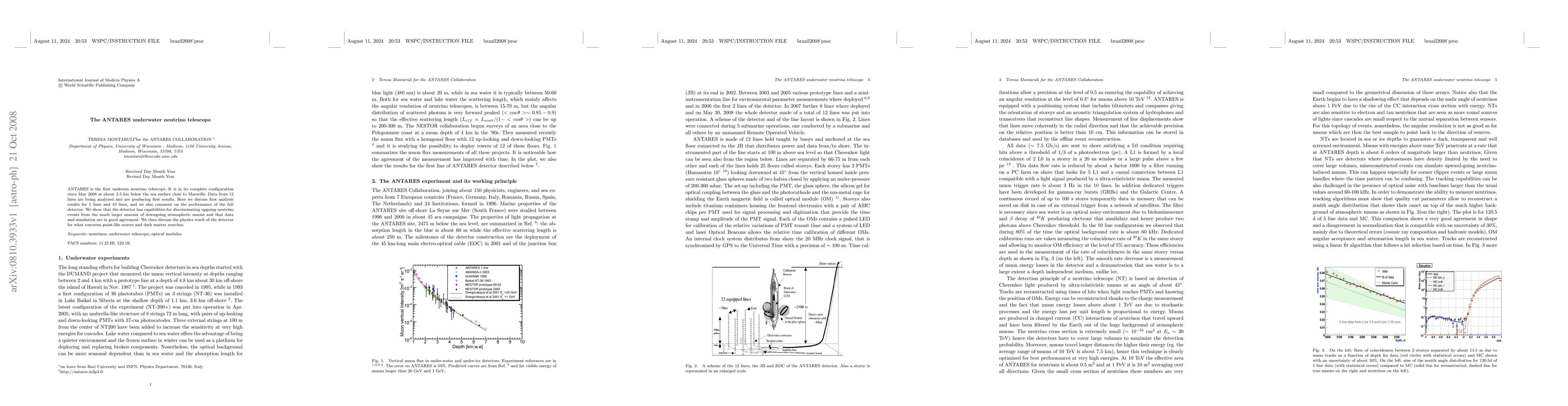 The ANTARES underwater neutrino telescope, operational since 2008, analyzes data from 12 lines to detect neutrino events, distinguishing them from atmospheric muons. Initial results from 5 and 10 lines show promising performance and potential for point-like source and dark matter searches.