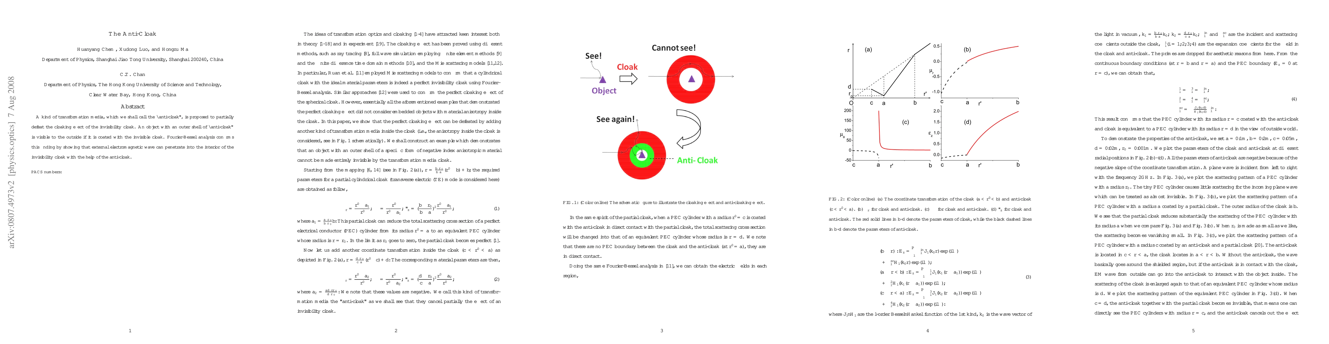 The paper proposes a novel "anti-cloak" transformation media designed to partially reveal objects hidden by traditional invisibility cloaks. Fourier-Bessel analysis verifies that the anti-cloak allows external electromagnetic waves to penetrate the invisibility cloak, making the hidden object visible.