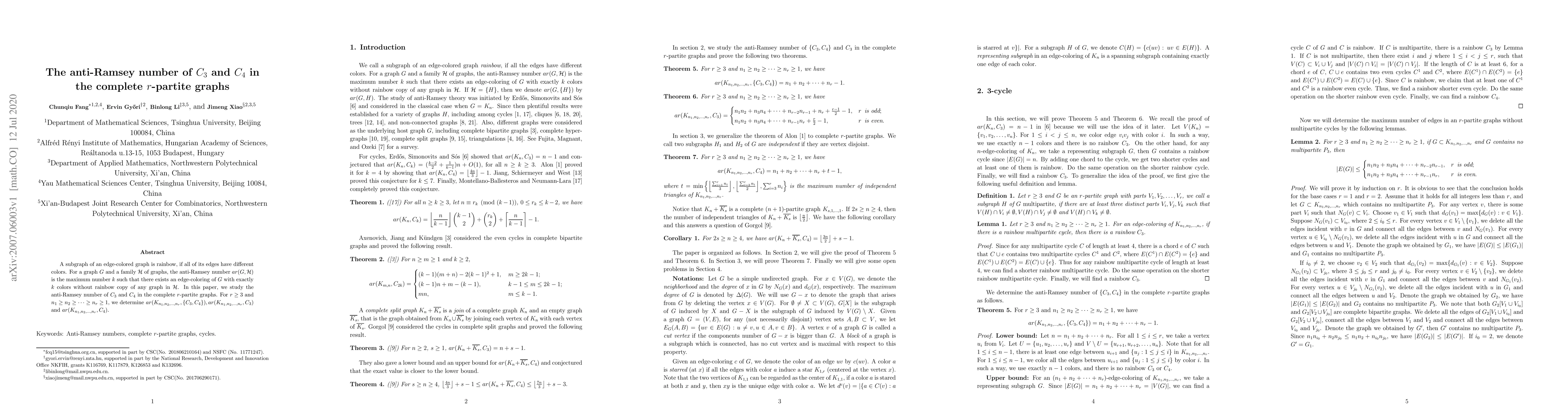 A subgraph of an edge-colored graph is rainbow, if all of its edges have different colors. For a graph $G$ and a family $\mathcal{H}$ of graphs, the anti-Ramsey number $ar(G, \mathcal{H})$ is the maximum number $k$ such that there exists an edge-coloring of $G$ with exactly $k$ colors without rainbow copy of any graph in $\mathcal{H}$. In this paper, we study the anti-Ramsey number of $C_{3}$ and $C_{4}$ in the complete $r$-partite graphs. For $r\ge 3$ and $n_{1}\ge n_{2}\ge \cdots\ge n_{r}\ge 1$, we determine $ ar(K_{n_{1}, n_{2}, \ldots, n_{r}},\{C_{3}, C_{4}\}), ar(K_{n_{1}, n_{2}, \ldots, n_{r}}, C_{3})$ and $ar(K_{n_{1}, n_{2}, \ldots, n_{r}}, C_{4})$.