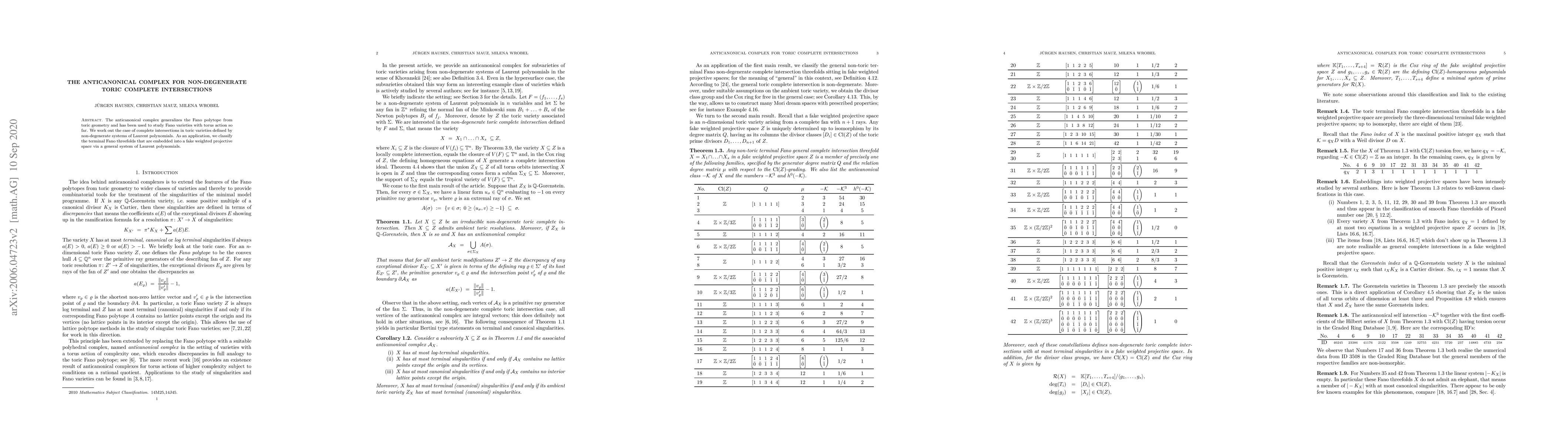 The anticanonical complex generalizes the Fano polytope from toric geometry and has been used to study Fano varieties with torus action so far. We work out the case of complete intersections in toric varieties defined by non-degenerate systems of Laurent polynomials. As an application, we classify the terminal Fano threefolds that are embedded into a fake weighted projective space via a general system of Laurent polynomials.