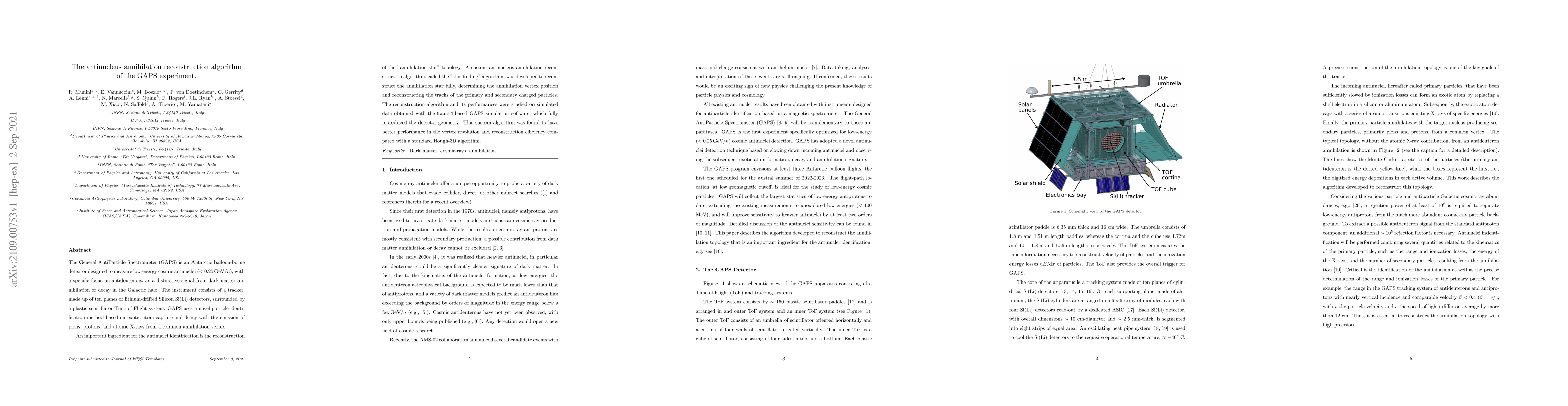 The General AntiParticle Spectrometer (GAPS) is an Antarctic balloon-borne detector designed to measure low-energy cosmic antinuclei (< 0.25 GeV/n), with a specific focus on antideuterons, as a distinctive signal from dark matter annihilation or decay in the Galactic halo. The instrument consists of a tracker, made up of ten planes of lithium-drifted Silicon Si(Li) detectors, surrounded by a plastic scintillator Time-of-Flight system. GAPS uses a novel particle identification method based on exotic atom capture and decay with the emission of pions, protons, and atomic X-rays from a common annihilation vertex. An important ingredient for the antinuclei identification is the reconstruction of the "annihilation star" topology. A custom antinucleus annihilation reconstruction algorithm, called the "star-finding" algorithm, was developed to reconstruct the annihilation star fully, determining the annihilation vertex position and reconstructing the tracks of the primary and secondary charged particles. The reconstruction algorithm and its performances were studied on simulated data obtained with the Geant4-based GAPS simulation software, which fully reproduced the detector geometry. This custom algorithm was found to have better performance in the vertex resolution and reconstruction efficiency compared with a standard Hough-3D algorithm.