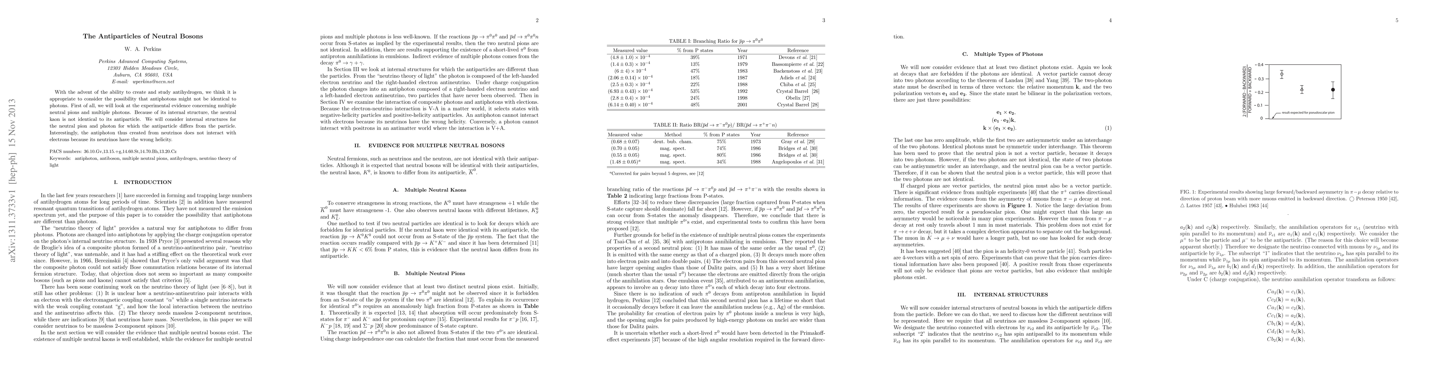 With the advent of the ability to create and study antihydrogen, we think it is appropriate to consider the possibility that antiphotons might not be identical to photons. First of all, we will look at the experimental evidence concerning multiple neutral pions and multiple photons. Because of its internal structure, the neutral kaon is not identical to its antiparticle. We will consider internal structures for the neutral pion and photon for which the antiparticle differs from the particle. Interestingly, the antiphoton thus created from neutrinos does not interact with electrons because its neutrinos have the wrong helicity.