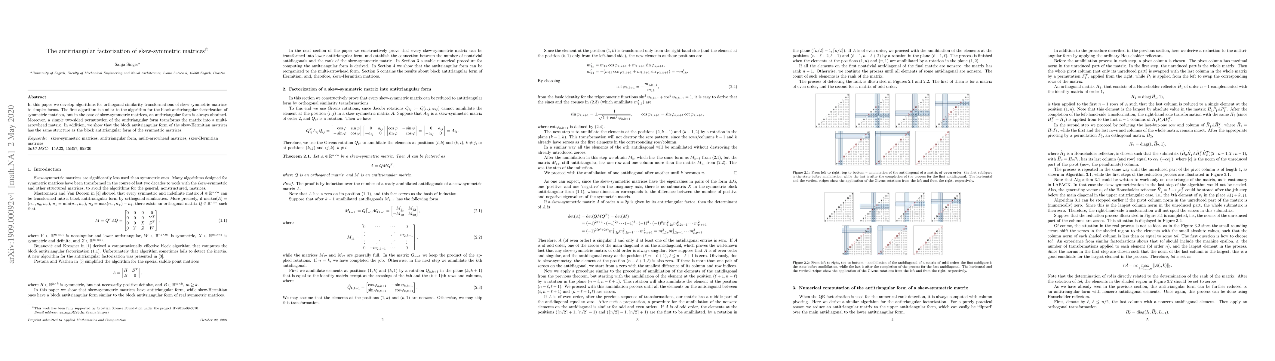 This paper presents algorithms for orthogonal transformations that simplify skew-symmetric matrices into antitriangular forms, analogous to symmetric matrices' block antitriangular factorization, and extends these methods to skew-Hermitian matrices. The algorithms also enable a permutation transforming the matrix into a multi-arrowhead form.