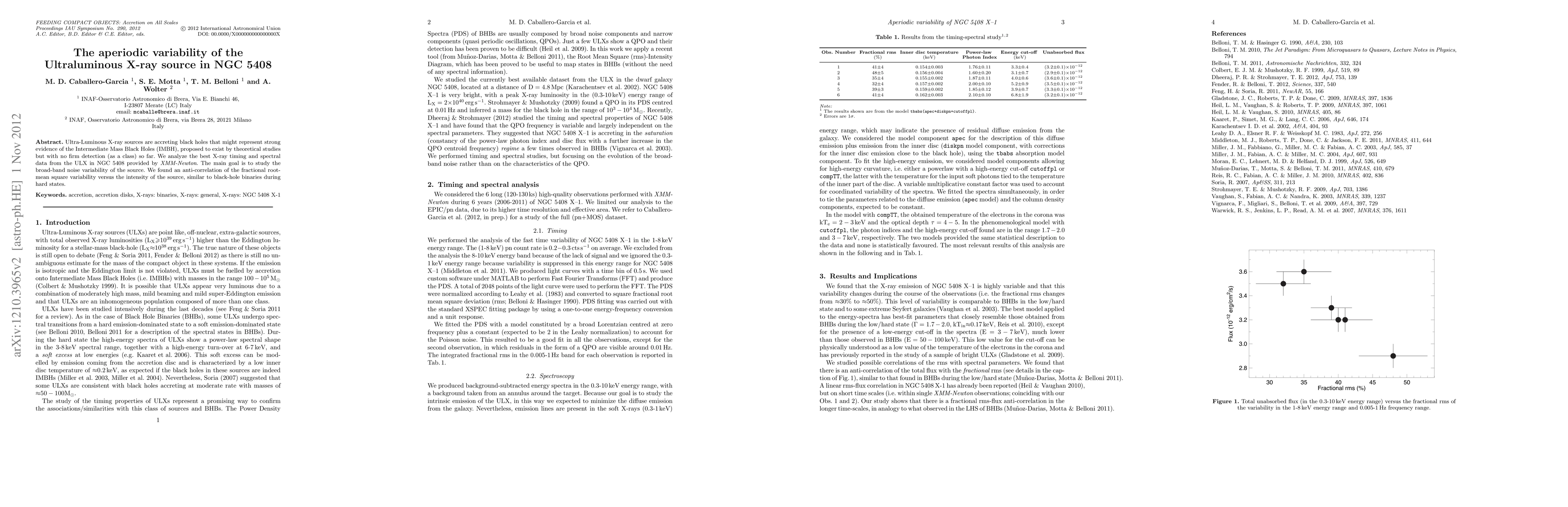 Ultra-Luminous X-ray sources are accreting black holes that might represent strong evidence of the Intermediate Mass Black Holes (IMBH), proposed to exist by theoretical studies but with no firm detection (as a class) so far. We analyze the best X-ray timing and spectral data from the ULX in NGC 5408 provided by XMM-Newton. The main goal is to study the broad-band noise variability of the source. We found an anti-correlation of the fractional root-mean square variability versus the intensity of the source, similar to black-hole binaries during hard states.