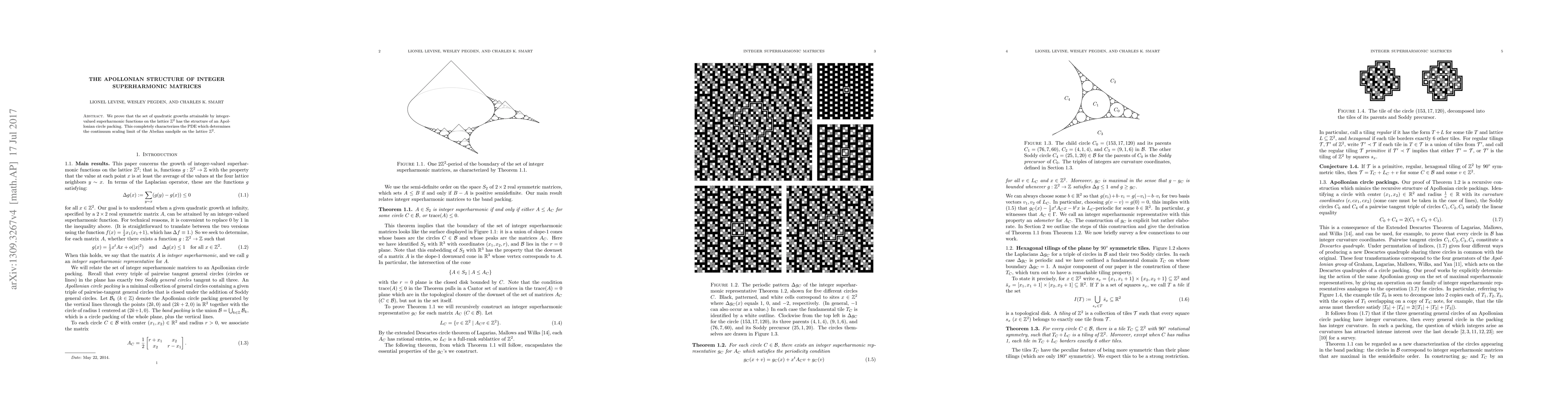 Summary: This paper proves that quadratic growths of integer-valued superharmonic functions on $\mathbb{Z}^2$ form an Apollonian circle packing, fully characterizing the PDE governing the continuum limit of the Abelian sandpile model on the lattice.
