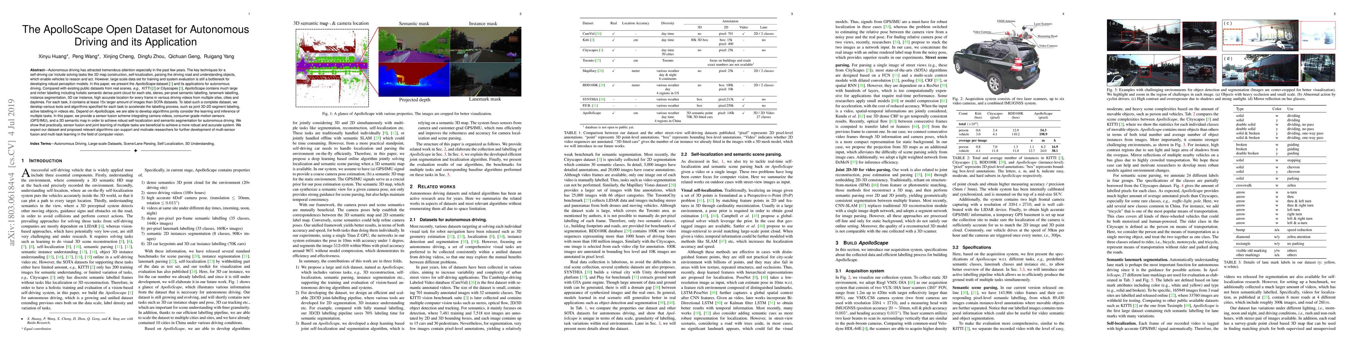 The ApolloScape dataset is a large-scale, richly labeled resource for autonomous driving, featuring extensive semantic dense point cloud, stereo, lanemark, and instance segmentation data. The dataset supports multi-sensor fusion and multi-task learning, enabling robust self-localization and semantic segmentation, and aims to advance research in computer vision.