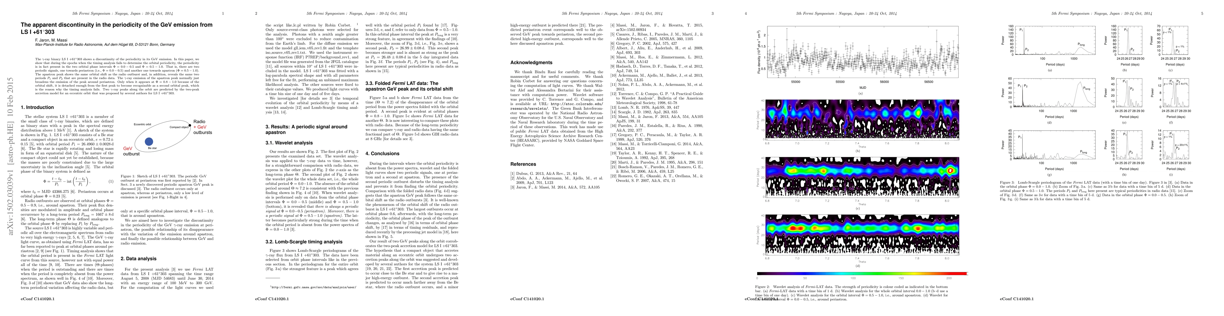 The gamma-ray binary LS I +61{\deg}303 shows a discontinuity of the periodicity in its GeV emission. In this paper, we show that during the epochs when the timing analysis fails to determine the orbital periodicity, the periodicity is in fact present in the two orbital phase intervals $\Phi = 0.0-0.5$ and $\Phi = 0.5-1.0$. That is, there are two periodic signals, one towards periastron (i.e., $\Phi = 0.0-0.5$) and another one towards apastron ($\Phi = 0.5-1.0$). The apastron peak shows the same orbital shift as the radio outburst and, in addition, reveals the same two periods $P_1$ and $P_2$ that are present in the radio data. The gamma-ray emission of the apastron peak normally just broadens the emission of the peak around periastron. Only when it appears at $\Phi = 0.8-1.0$, because of the orbital shift, it is detached enough from the first peak to become recognizable as a second orbital peak, which is the reason why the timing analysis fails. Two gamma-ray peaks along the orbit are predicted by the two-peak accretion model for an eccentric orbit that was proposed by several authors for LS I +61{\deg}303.