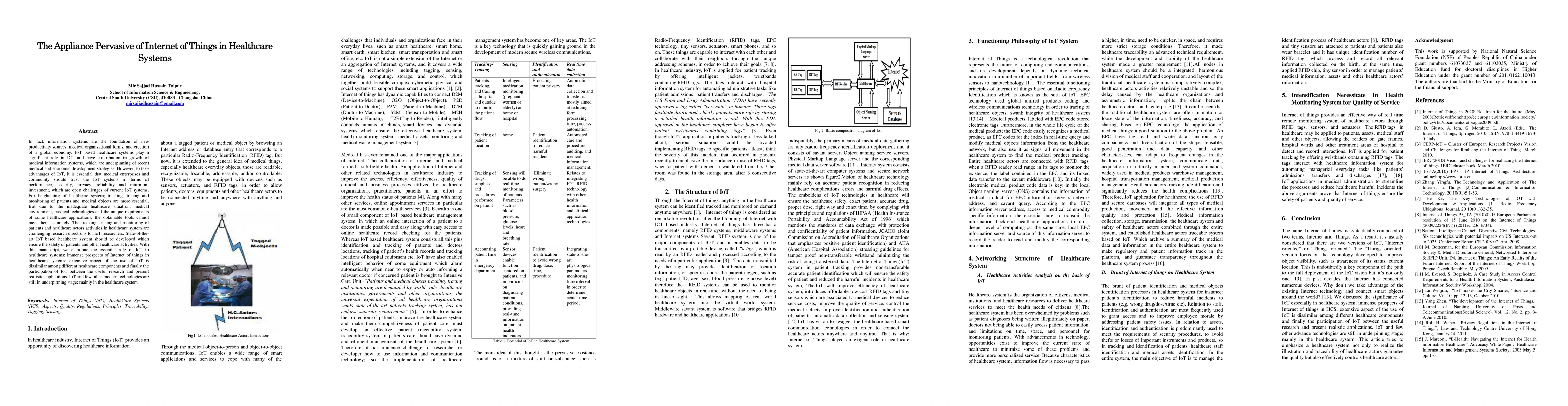 This paper highlights the importance of Internet of Things in healthcare systems, focusing on challenges such as trust, security, and privacy, while exploring its potential for tracking, tracing, and monitoring patients and medical objects.