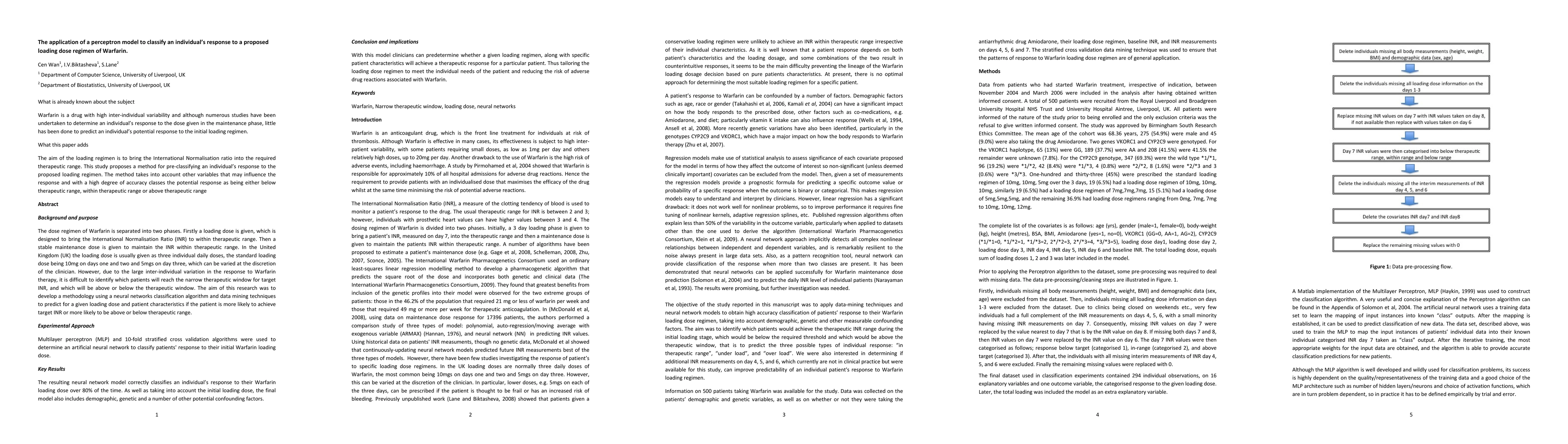 The dose regimen of Warfarin is separated into two phases. Firstly a loading dose is given, which is designed to bring the International Normalisation Ratio (INR) to within therapeutic range. Then a stable maintenance dose is given to maintain the INR within therapeutic range. In the United Kingdom (UK) the loading dose is usually given as three individual daily doses, the standard loading dose being 10mg on days one and two and 5mgs on day three, which can be varied at the discretion of the clinician. However, due to the large inter-individual variation in the response to Warfarin therapy, it is difficult to identify which patients will reach the narrow therapeutic window for target INR, and which will be above or below the therapeutic window. The aim of this research was to develop a methodology using a neural networks classification algorithm and data mining techniques to predict for a given loading dose and patient characteristics if the patient is more likely to achieve target INR or more likely to be above or below therapeutic range. Multilayer perceptron (MLP) and 10-fold stratified cross validation algorithms were used to determine an artificial neural network to classify patients' response to their initial Warfarin loading dose. The resulting neural network model correctly classifies an individual's response to their Warfarin loading dose over 80% of the time. As well as taking into account the initial loading dose, the final model also includes demographic, genetic and a number of other potential confounding factors. With this model clinicians can predetermine whether a given loading regimen, along with specific patient characteristics will achieve a therapeutic response for a particular patient. Thus tailoring the loading dose regimen to meet the individual needs of the patient and reducing the risk of adverse drug reactions associated with Warfarin.