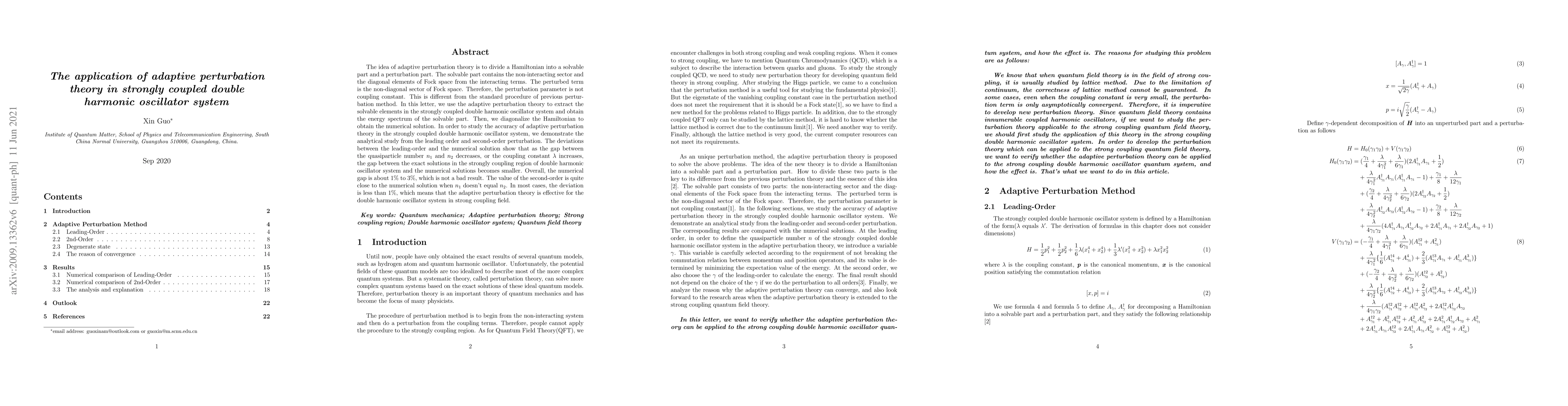 This paper applies adaptive perturbation theory to a strongly coupled double harmonic oscillator system, dividing the Hamiltonian into a solvable part and a perturbation part. The results show that the adaptive method is effective, with numerical gaps of 1% to 3% and second-order perturbation deviations less than 1% in most cases.