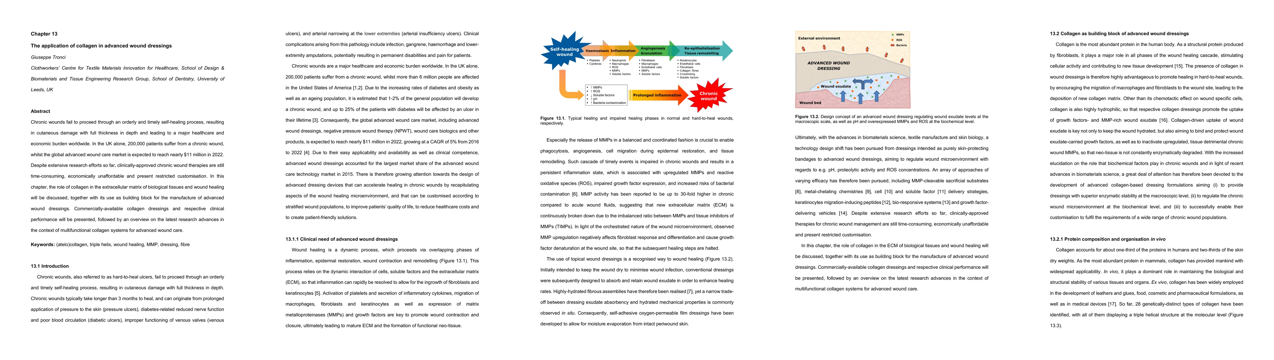 This paper discusses the role of collagen in wound healing and its application in advanced wound dressings, highlighting its benefits and the latest research on multifunctional collagen systems to improve chronic wound care. It reviews commercially-available collagen dressings and their clinical performance, emphasizing the need for more effective and affordable therapies.