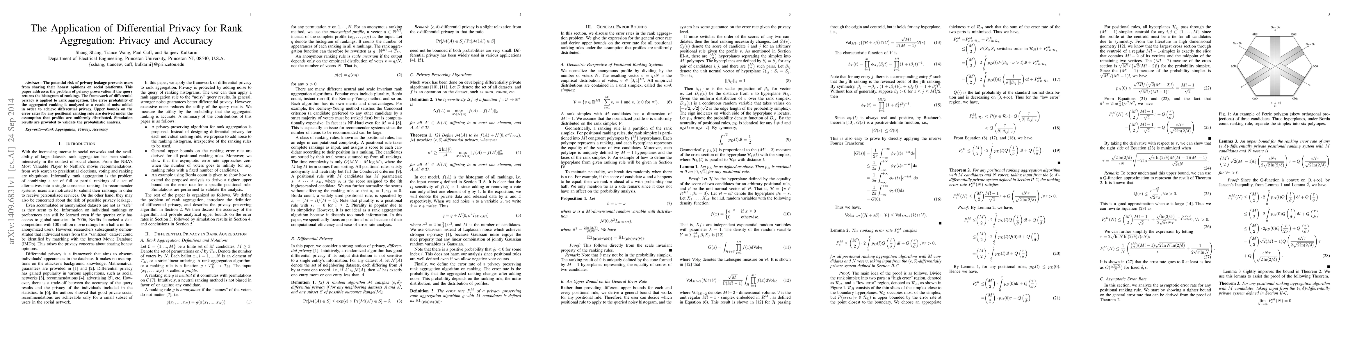 This paper applies differential privacy to rank aggregation to protect user privacy while maintaining ranking accuracy. It analyzes the error introduced by noise and provides upper bounds on error rates under uniform distribution assumptions, validated by simulations.