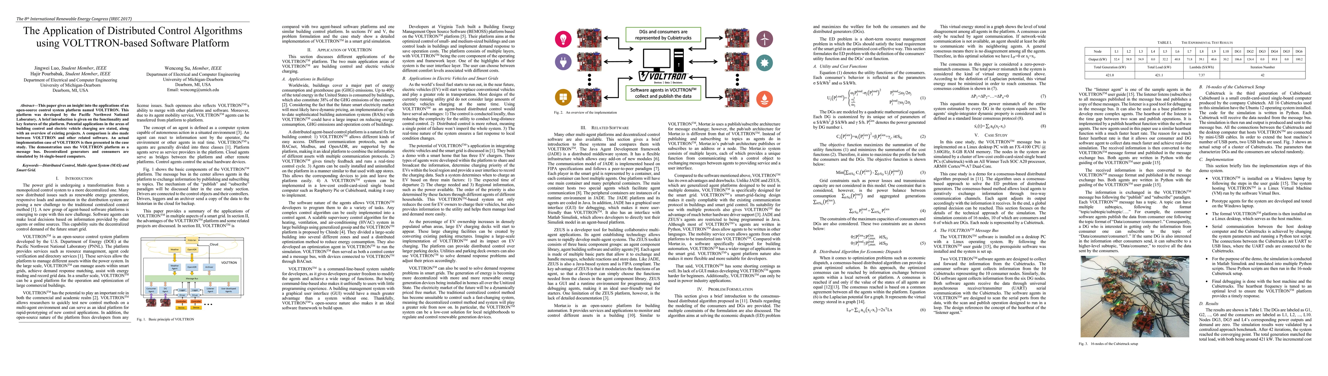 This paper gives an insight into the applications of an open-source control system platform named VOLTTRON. This platform was developed by the Pacific Northwest National Laboratory. A brief introduction is given on the functionality and key features of the platform. Potential applications in the areas of building control and electric vehicle charging are stated, along with an overview of existing projects. A comparison is also made between VOLTTRON and other related software. An actual implementation case of VOLTTRON is then presented in the case study. The demonstration uses the VOLTTRON platform as a message bus. Decentralized generators and consumers are simulated by 16 single-board computers.