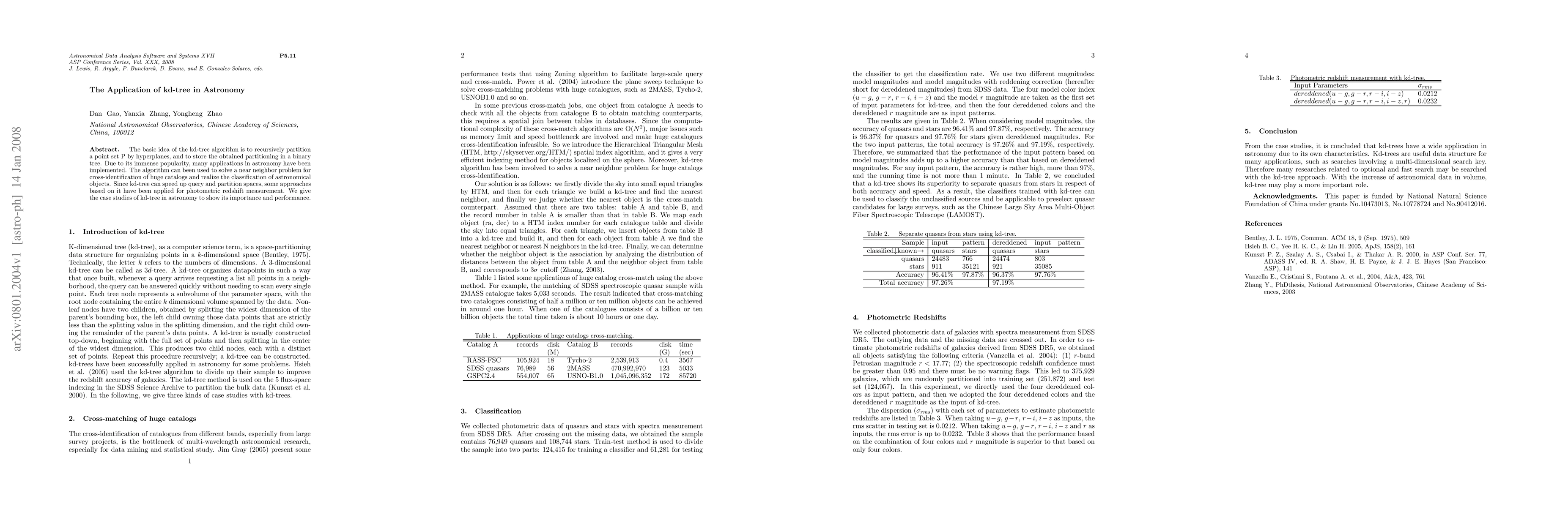 The basic idea of the kd-tree algorithm is to recursively partition a point set P by hyperplanes, and to store the obtained partitioning in a binary tree. Due to its immense popularity, many applications in astronomy have been implemented. The algorithm can been used to solve a near neighbor problem for cross-identification of huge catalogs and realize the classification of astronomical objects. Since kd-tree can speed up query and partition spaces, some approaches based on it have been applied for photometric redshift measurement. We give the case studies of kd-tree in astronomy to show its importance and performance.