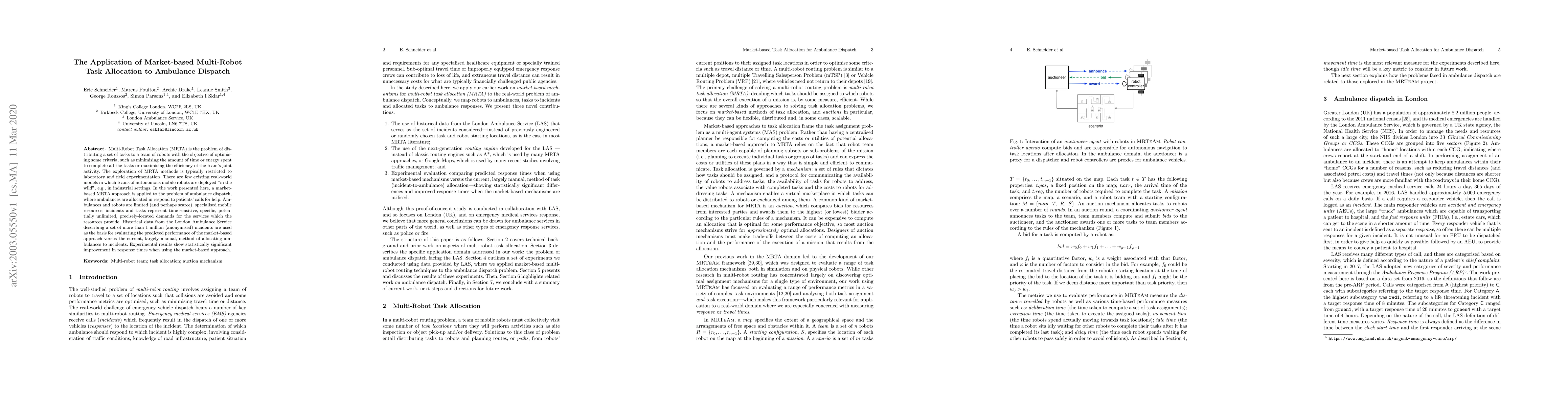Multi-Robot Task Allocation (MRTA) is the problem of distributing a set of tasks to a team of robots with the objective of optimising some criteria, such as minimising the amount of time or energy spent to complete all the tasks or maximising the efficiency of the team's joint activity. The exploration of MRTA methods is typically restricted to laboratory and field experimentation. There are few existing real-world models in which teams of autonomous mobile robots are deployed "in the wild", e.g., in industrial settings. In the work presented here, a market-based MRTA approach is applied to the problem of ambulance dispatch, where ambulances are allocated in respond to patients' calls for help. Ambulances and robots are limited (and perhaps scarce), specialised mobile resources; incidents and tasks represent time-sensitive, specific, potentially unlimited, precisely-located demands for the services which the resources provide. Historical data from the London Ambulance Service describing a set of more than 1 million (anonymised) incidents are used as the basis for evaluating the predicted performance of the market-based approach versus the current, largely manual, method of allocating ambulances to incidents. Experimental results show statistically significant improvement in response times when using the market-based approach.