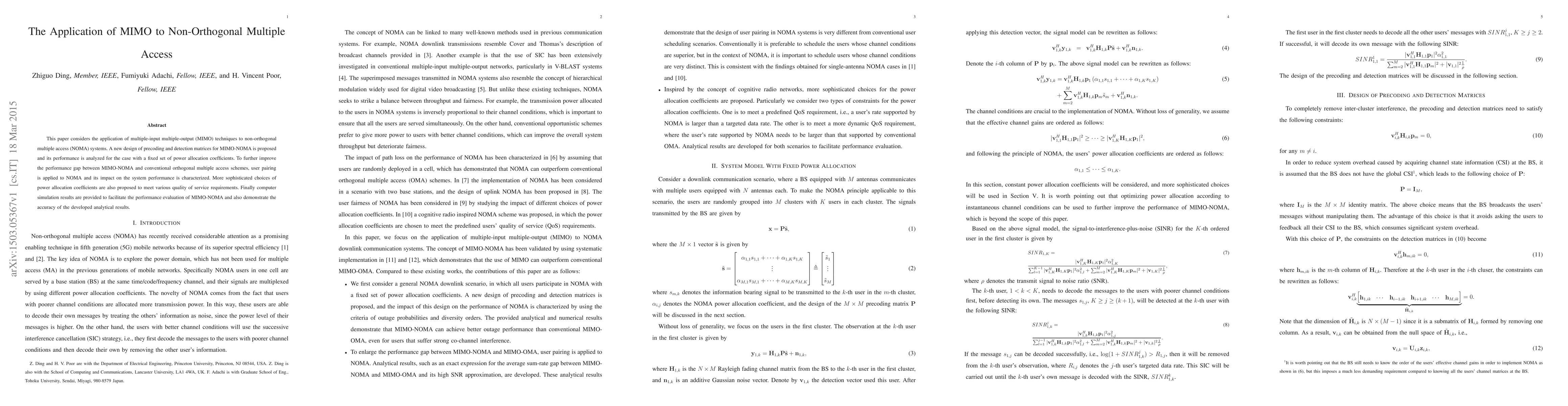 This paper considers the application of multiple-input multiple-output (MIMO) techniques to non-orthogonal multiple access (NOMA) systems. A new design of precoding and detection matrices for MIMO-NOMA is proposed and its performance is analyzed for the case with a fixed set of power allocation coefficients. To further improve the performance gap between MIMO-NOMA and conventional orthogonal multiple access schemes, user pairing is applied to NOMA and its impact on the system performance is characterized. More sophisticated choices of power allocation coefficients are also proposed to meet various quality of service requirements. Finally computer simulation results are provided to facilitate the performance evaluation of MIMO-NOMA and also demonstrate the accuracy of the developed analytical results.