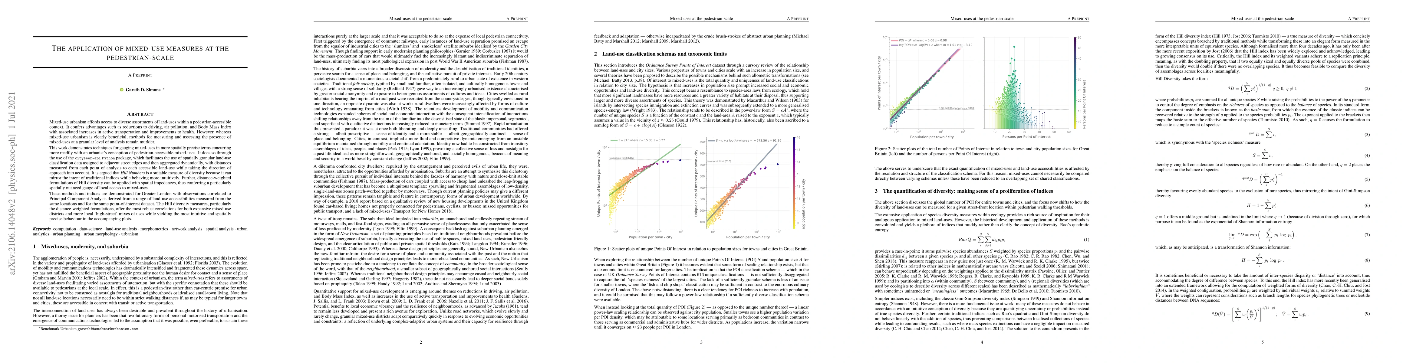Mixed-use urbanism affords access to diverse assortments of land-uses within a pedestrian-accessible context. It confers advantages such as reductions to driving, air pollution, and Body Mass Index with associated increases in active transportation and improvements to health. However, whereas mixed-use urbanism is clearly beneficial, methods for measuring and assessing the presence of mixed-uses at a granular level of analysis remain murkier. This work demonstrates techniques for gauging mixed-uses in more spatially precise terms concurring more readily with an urbanist's conception of pedestrian-accessible mixed-uses. It does so through the use of the cityseer-api Python package, which facilitates the use of spatially granular land-use classification data assigned to adjacent street edges and then aggregated dynamically, with distances measured from each point of analysis to each accessible land-use while taking the direction of approach into account. It is argued that Hill Numbers is a suitable measure of diversity because it can mirror the intent of traditional indices while behaving more intuitively. Further, distance-weighted formulations of Hill diversity can be applied with spatial impedances, thus conferring a particularly spatially nuanced gauge of local access to mixed-uses. These methods and indices are demonstrated for Greater London with observations correlated to Principal Component Analysis derived from a range of land-use accessibilities measured from the same locations and for the same point-of-interest dataset. The Hill diversity measures, particularly the distance-weighted formulations, offer the most robust correlations for both expansive mixed-use districts and more local 'high-street' mixes of uses while yielding the most intuitive and spatially precise behaviour in the accompanying plots.