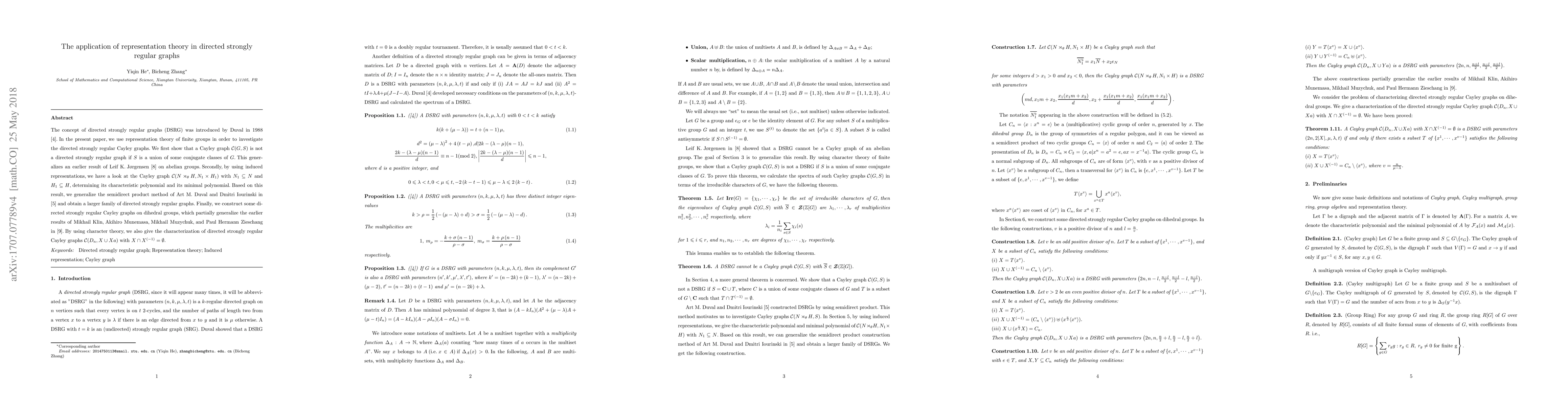 This paper applies representation theory to study directed strongly regular Cayley graphs, proving that $\mathcal{C}(G,S)$ is not DSRG if $S$ is a union of conjugate classes, and generalizes earlier results. It also generalizes the semidirect product method to find characteristic and minimal polynomials for specific Cayley graphs, and characterizes DSRG Cayley graphs on dihedral groups.