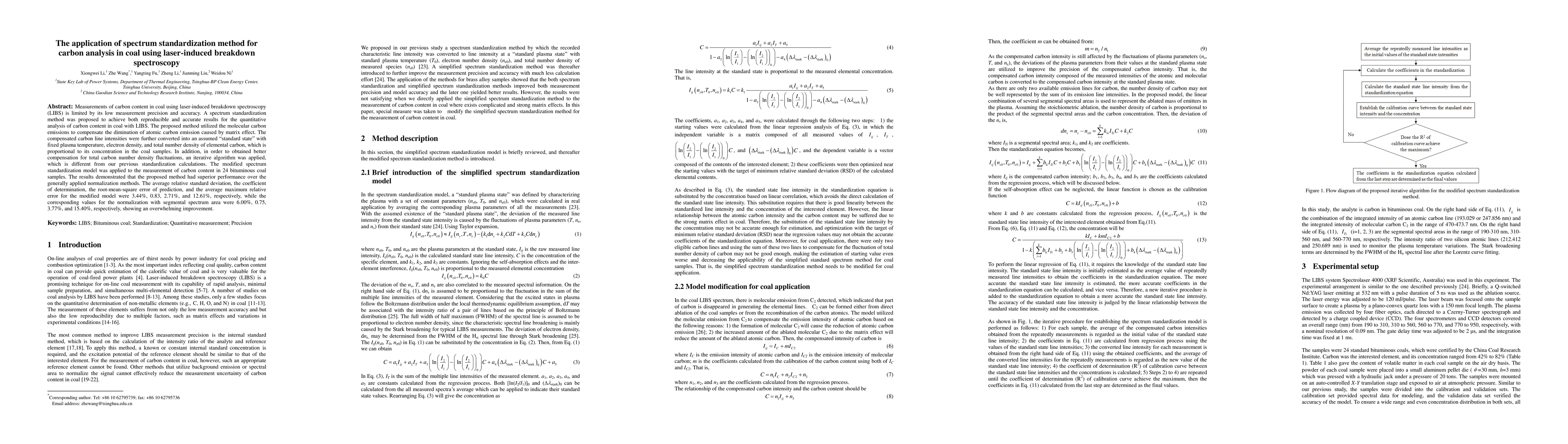 Measurements of carbon content in coal using laser-induced breakdown spectroscopy (LIBS) is limited by its low measurement precision and accuracy. A spectrum standardization method was proposed to achieve both reproducible and accurate results for the quantitative analysis of carbon content in coal with LIBS. The proposed method utilized the molecular carbon emissions to compensate the diminution of atomic carbon emission caused by matrix effect. The compensated carbon line intensities were further converted into an assumed standard state with fixed plasma temperature, electron density, and total number density of elemental carbon, which is proportional to its concentration in the coal samples. In addition, in order to obtained better compensation for total carbon number density fluctuations, an iterative algorithm was applied, which is different from our previous standardization calculations. The modified spectrum standardization model was applied to the measurement of carbon content in 24 bituminous coal samples. The results demonstrated that the proposed method had superior performance over the generally applied normalization methods. The average relative standard deviation, the coefficient of determination, the root-mean-square error of prediction, and the average maximum relative error for the modified model were 3.44%, 0.83, 2.71%, and 12.61%, respectively, while the corresponding values for the normalization with segmental spectrum area were 6.00%, 0.75, 3.77%, and 15.40%, respectively, showing an overwhelming improvement.