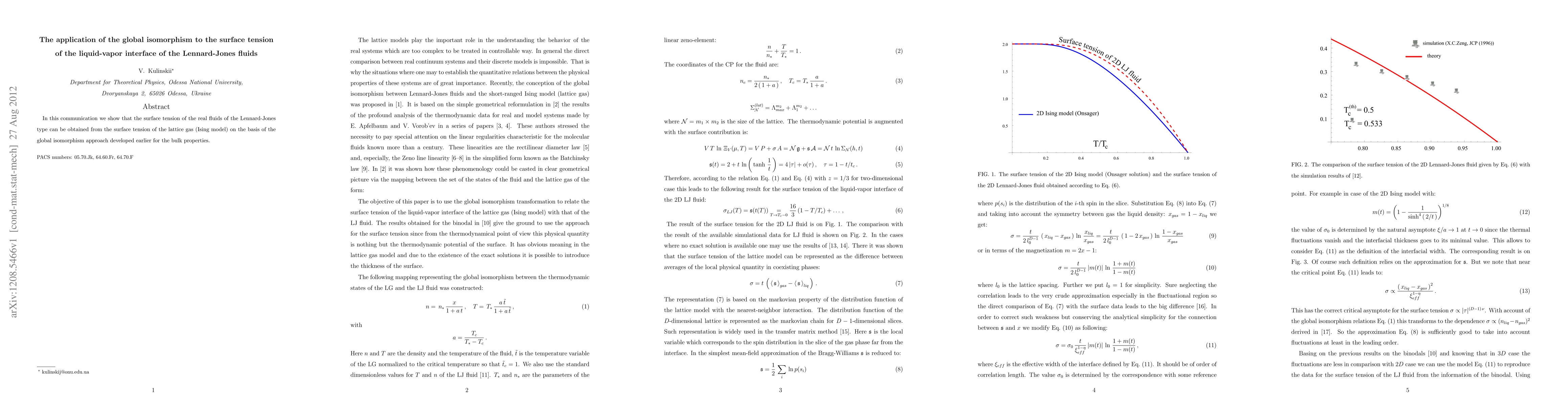 Summary: This paper demonstrates the application of the global isomorphism approach to derive the surface tension of Lennard-Jones fluids from the lattice gas (Ising model) surface tension, extending the method previously used for bulk properties.