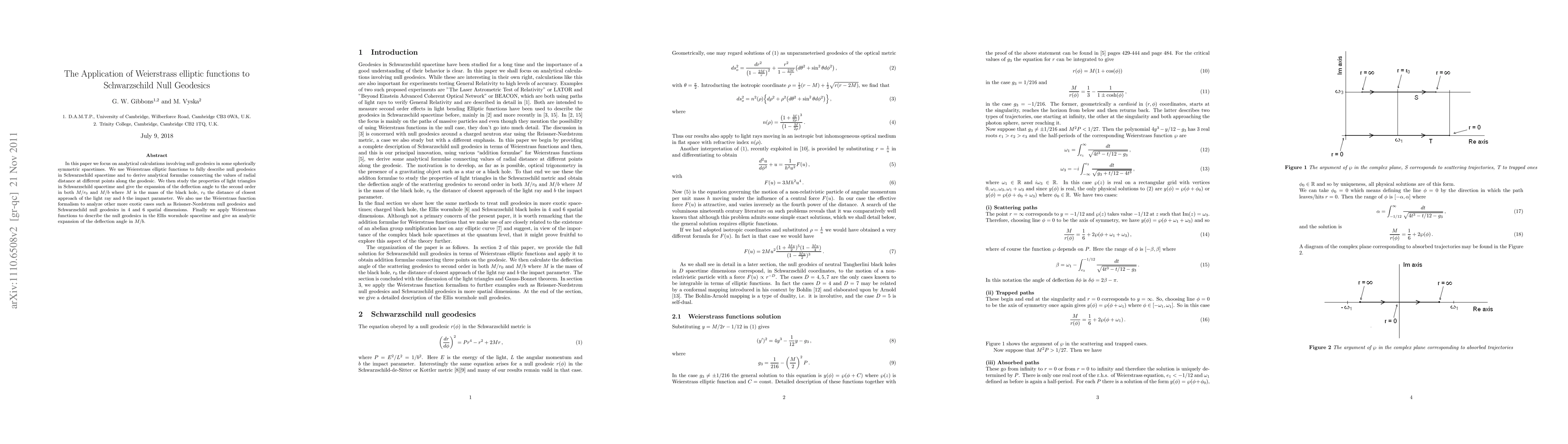This paper utilizes Weierstrass elliptic functions to analytically describe null geodesics in Schwarzschild spacetime, deriving formulae for radial distance and analyzing light triangles. It also extends the analysis to Reissner-Nordström, higher-dimensional Schwarzschild, and Ellis wormhole spacetimes, providing expansions for deflection angles.