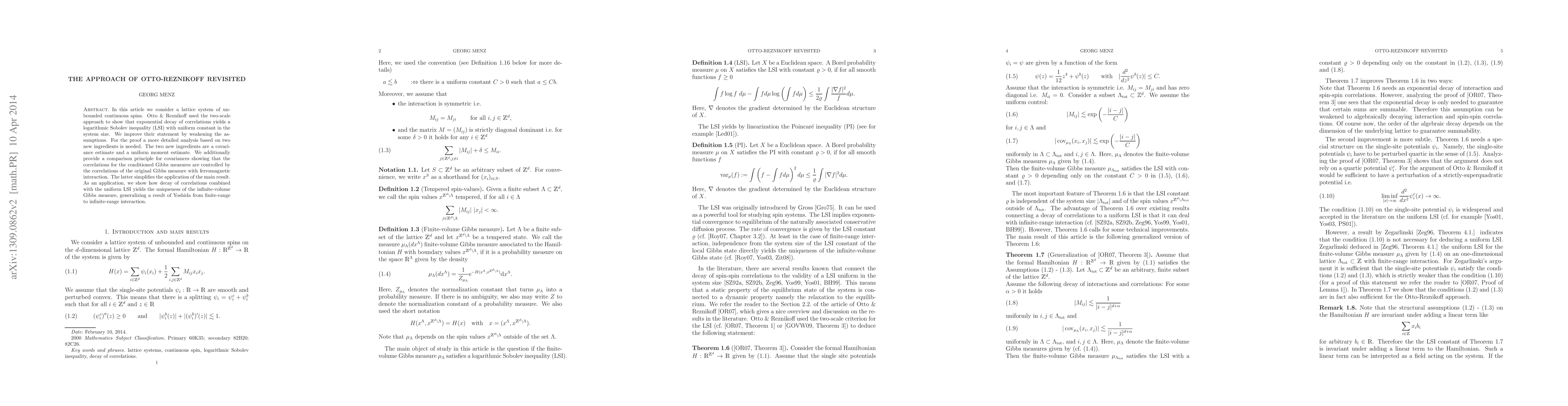 In this article we consider a lattice system of unbounded continuos spins. Otto & Reznikoff used the two-scale approach to show that exponential decay of correlations yields a logarithmic Sobolev inequality (LSI) with uniform constant in the system size. We improve their statement by weakening the assumptions. For the proof a more detailed analysis based on two new ingredients is needed. The two new ingredients are a new basic covariance estimate and a uniform moment estimate. We additionally provide a comparison principle for covariances showing that the correlations for the conditioned Gibbs measures are controlled by the correlations of the original Gibbs measure with ferromagnetic interaction. The latter simplifies the application of the main result. As an application, we show how decay of correlations combined with the uniform LSI yields the uniqueness of the infinite-volume Gibbs measure, generalizing a result of Yoshida form finite-range to infinite-range interaction.