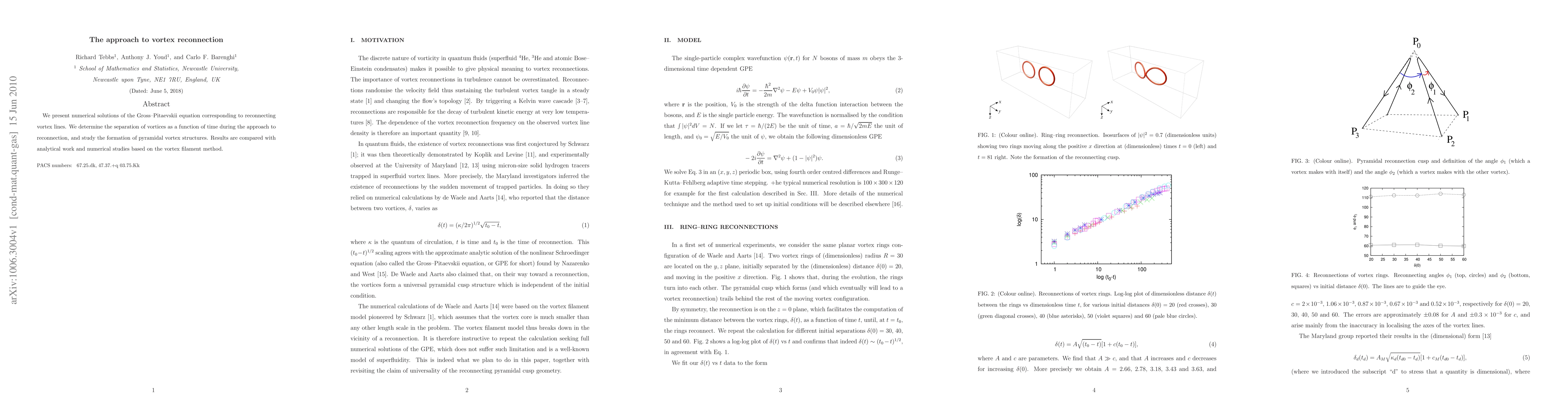 This paper numerically investigates the dynamics of vortex reconnection using the Gross-Pitaevskii equation, focusing on the temporal separation of vortices and the emergence of pyramidal vortex structures, and compares findings with analytical and filament method studies.